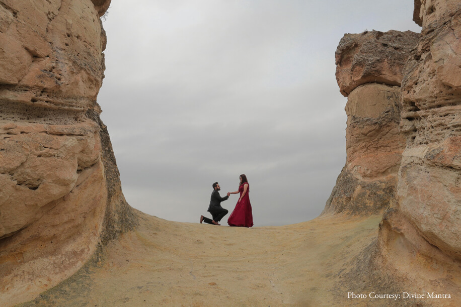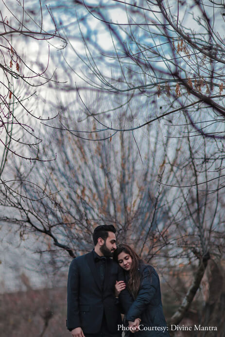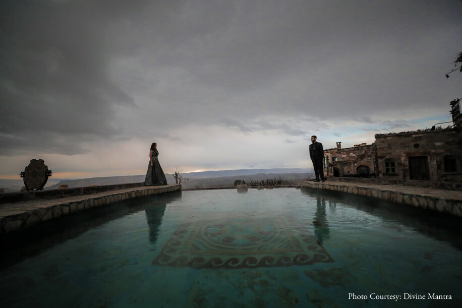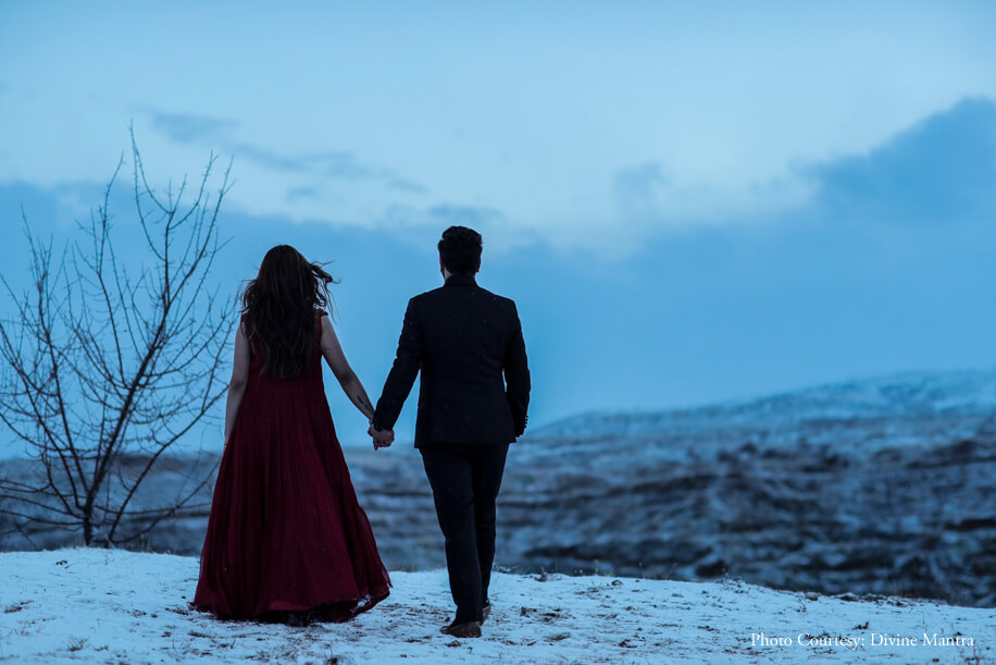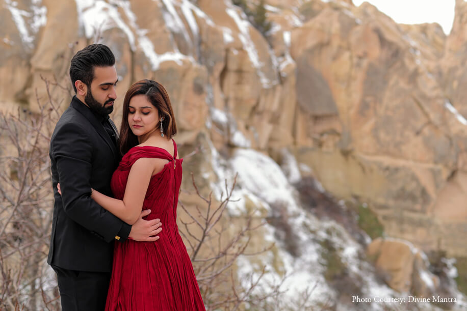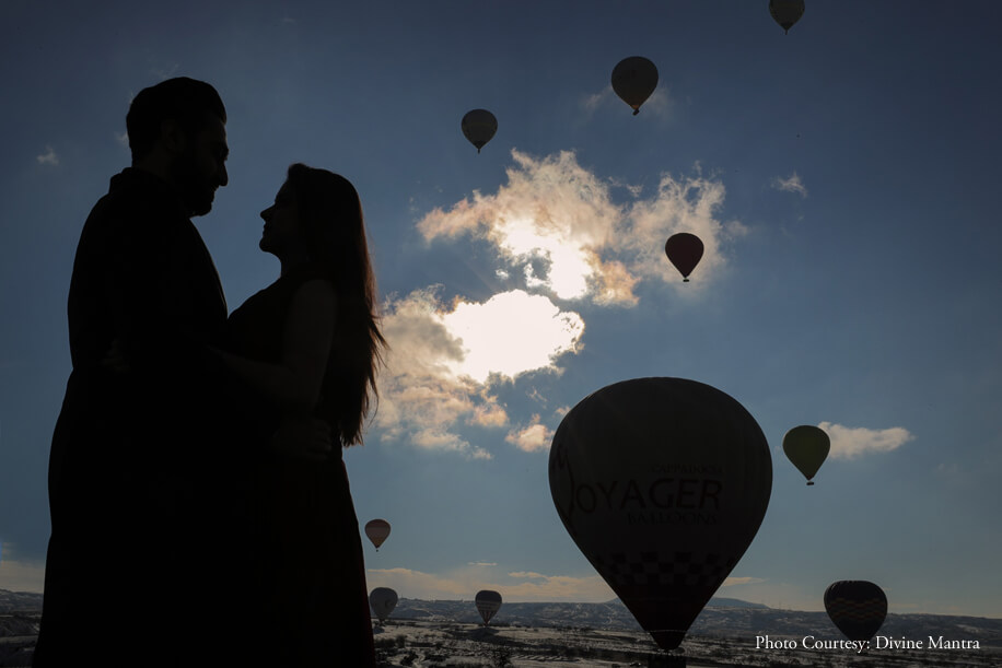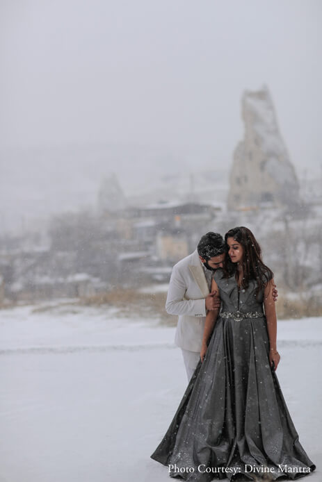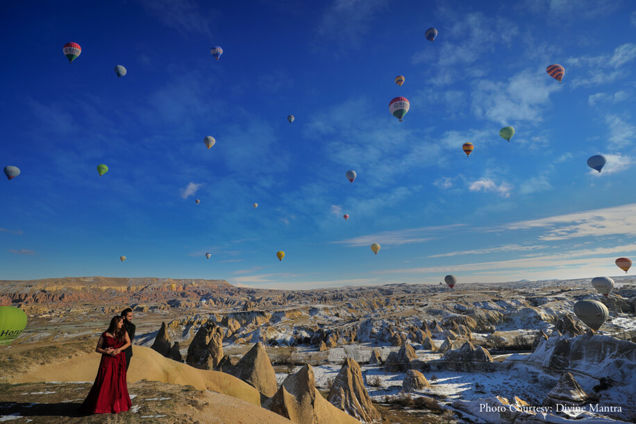 “Divine Mantra suggested we have our pre-wedding shoot in Cappadocia, Turkey. The surreal landscapes, the hot air balloons in the background and the snow helped make this the perfect locale for the photo shoot.