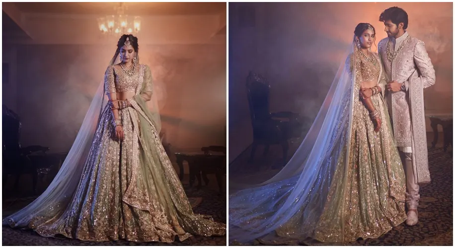 Newly-weds Niharika Konidela and Chaitanya JV returned to Hyderabad after their wedding festivities in Udaipur and held a grand reception for their friends and family. While Chaitanya picked an ice blue kurta and sherwani for the celebrations, it was Niharika Konidela who was a vision in a Manish Malhotra designed crystal-moss green tulle lehenga adorned with exquisite pearls, self-sequins, and a power trail.