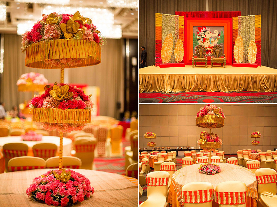 A Ganesh Puja was the perfect way to begin the wedding celebrations and both families organized a ceremony steeped in tradition in the lush environs of the JW Marriott, Pune. Celebrations took a cue from the family aesthetic and created a magnificent, awe-inspiring set up reminiscent of regal piety. The centerpiece was made with gotta- a traditional gold fabric from Rajasthan that radiates with timeless class. Hues of gold, orange and red were worked through the flower arrangement and fabrics which perfectly complemented the gleaming gotta. The occasion was divine.
