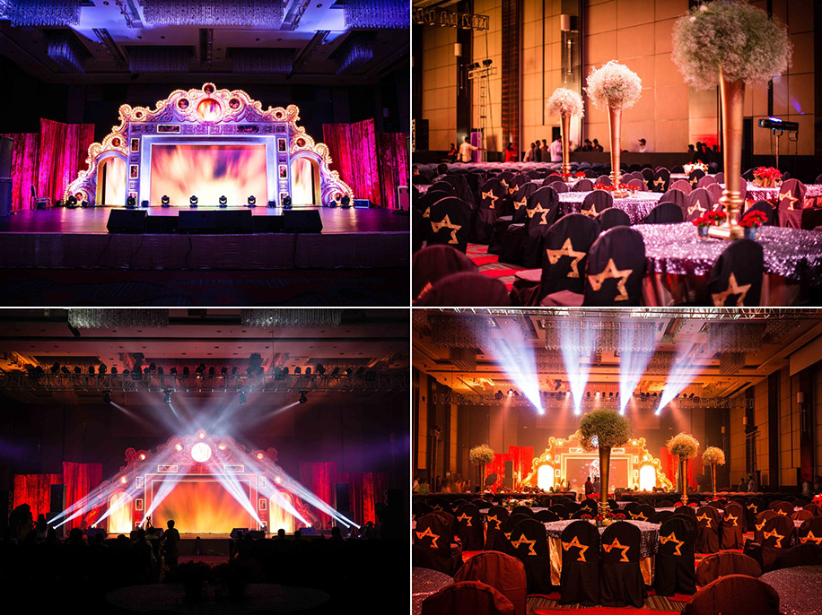 The sangeet was going to be magnificent and the décor had to live up to it. Celebrations took inspiration from the art of the burlesque – an over the top, glittery, glamorous edge – and crafted a vibe with the intelligent use of light, fabric and flowers. Guests walked through a grand entrance structure decorated with bulbs into the venue where shiny cushions gleamed and flower arrangements wowed besides larger-than-life pitchers. The grand stage was entirely decorated with a LED wall coupled with a bright colored backdrop featuring moving lights.