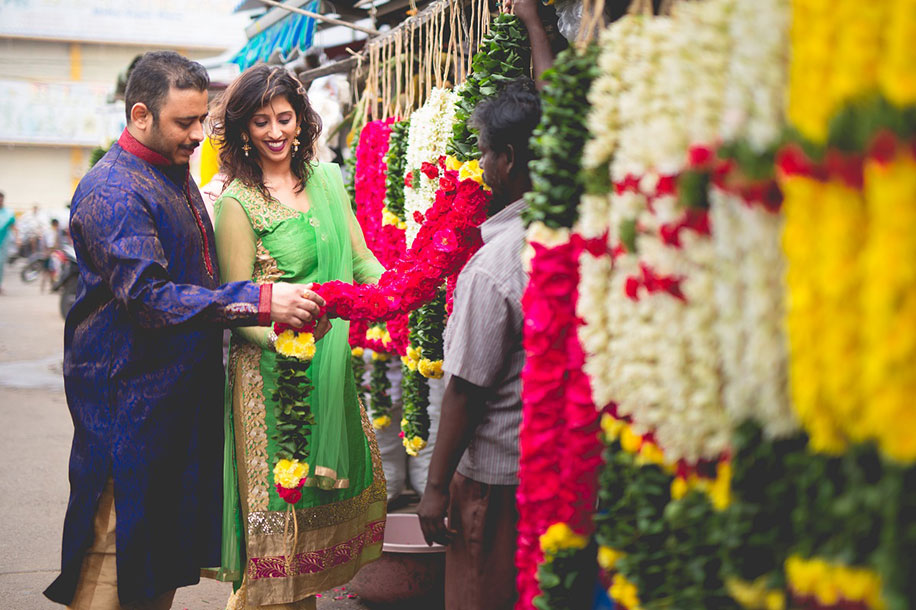 Nisha says, “We did most of our shoot in Mylapore, one of the oldest cultural hubs in Chennai. We’ve always been in awe of the remarkable architecture in India – whether it was monuments or places of worship. Temples in Chennai have a distinctive character that reflects the beautiful heritage of South India. We visited the Kapaleeshwar temple in Mylapore. Each sculpture on its roof was so unique. We walked through the bustling temple streets packed with vendors, worshipers and by-standers. The shopkeeper at one of the flower shops near the temple was so excited to be in one of our frames, he thought he was going to be on TV!”