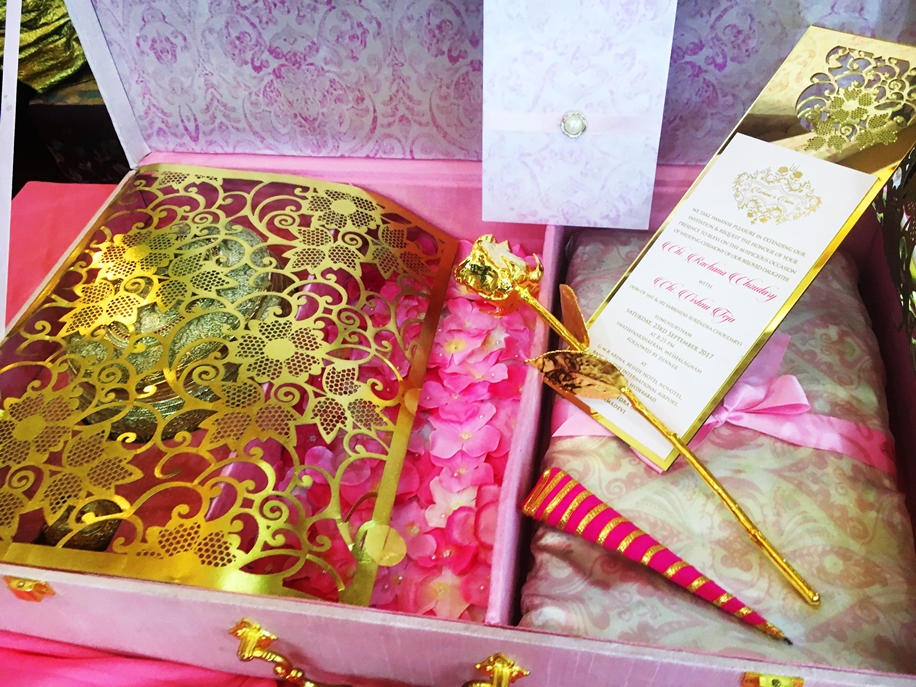 NTV chairman Narendra Choudhary’s daughter, Rachana Choudhary tied the knot with Coastal Group owner, Sabbineni Surendra’s son, Vishnu Teja at GMR Arena in Shamshabad. While their wedding was amongst the most luxurious events Hyderabad has witnessed, their grand invite, designed by WeddingSutra Favourite Puneet Gupta, also caught our attention!