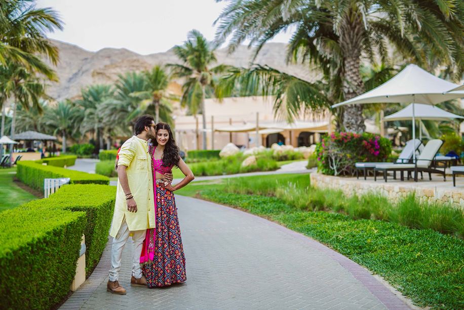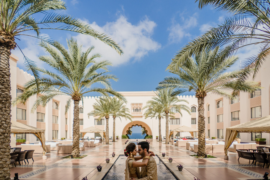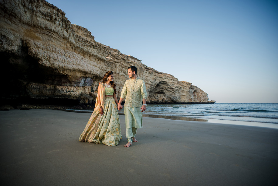 The sparkling Sea of Oman contrasts vividly with the curve of the mountains as they ease into the ocean behind the Shangri-La Barr Al Jissah Resort and Spa. The textures in the photograph – a rocky beach, the layers in the mountains, a clear sky, rippling water and the contrasting colors of the couples’ outfits made Neha and Pawan’s photographs look like something out of a fashion magazine.