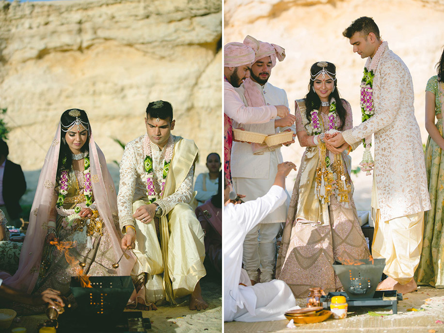 What is immediately evident is the sheer luxury of privacy in this exclusive beach at the Shangri-La Barr Al Jissah Resort and Spa. The hunk of gold mountain you can see in the pictures gives the couple’s pictures a feeling of being protected from the outside world; dramatic and romantic scenes at Ananya and Anish’s beach wedding.