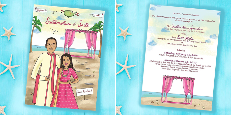 With designs that’ll take you down memory lane with its refreshing innocence, wedding invites designed by N.N Namratha are highly customizable and aptly capture the vibe of the venue along with personality quirks of the couple. Here’s how she added a beach themed twist to a wedding invite.