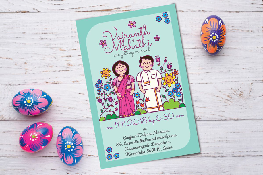 With colorful backdrops and animated subjects that mimic the couple’s persona, Doodlekari’s expressive designs not only keeps the viewer engaged but also brings an instant smile to the invitee’s face. A perfect example is this beautiful yet funny card with a contrasting mauve background hue.