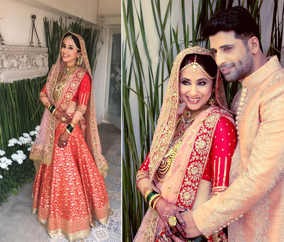 Urmila Matondkar chose to go with her all-time favorite designer and friend – Manish Malhotra, who dressed her beautifully for her special day. Manish picked a red and pink color palette for a bespoke brocade lehenga that included intricate gotta patti work on the dupatta.