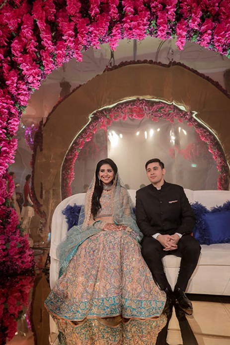 Marjhan looked queenly in a customized light blue and peach lehenga by Nomi Ansari with heavy embroidery for her lavish sangeet at the Four Seasons Resort Dubai at Jumeirah Beach.