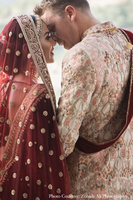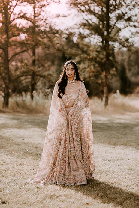 For her Indian fusion wedding in Portugal, Saloni wore a pale pink lehenga from Sara Design Studio by Rashi with beautiful thread work that exuded exotic elegance from top to toe.