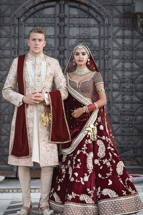 For her wedding in Udaipur, Diipa wore a dark maroon lehenga by Sabyasachi with a skirt that was resplendent with floral motifs. Her jewellery included an ornate gold choker set, a ‘matha patti’ (a head ornament) and a set of beautiful bangles.