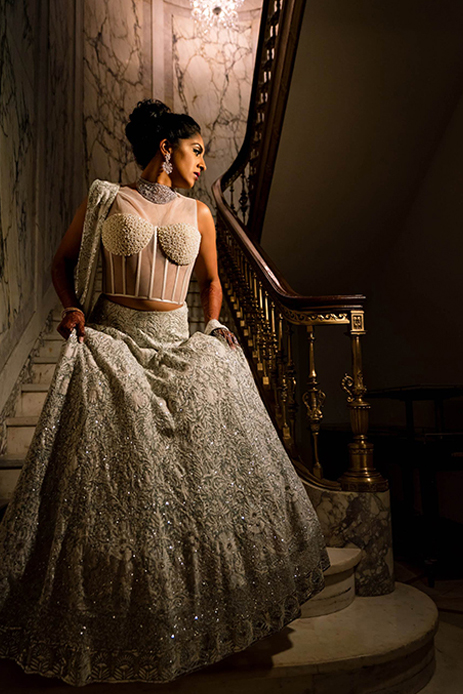 For the reception in New York, Priyanka picked a white lehenga heavy with Kashmiri embroidery that sparkled with blue sequins. She traded the original blouse with an edgy studded corset style top to make a statement.
