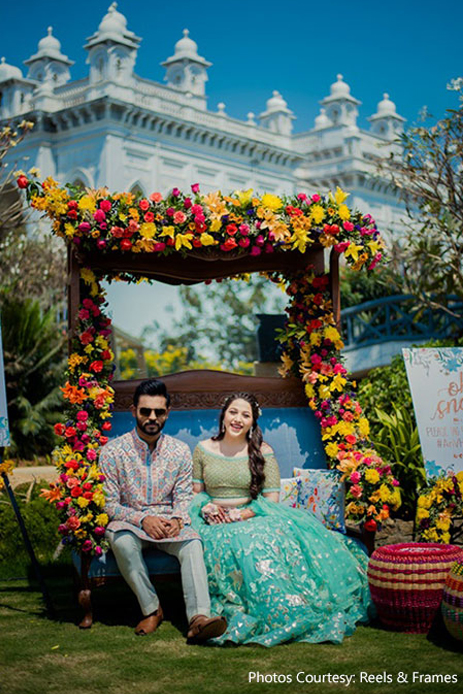 Anahita looked radiant in a teal blue lehenga for her vibrant mehndi function at Taj Falaknuma Palace in Hyderabad. She paired her outfit with minimal jewellery including a floral ‘haath phool’ (hand ornament) and earrings.