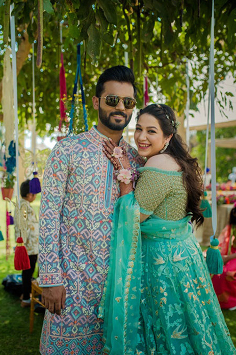 For her vibrant haldi ceremony, Megha chose a bright yellow Aastha Narang lehenga with sequins that formed checkered patterns on the full-sleeved blouse while the skirt was covered in floral patterns.