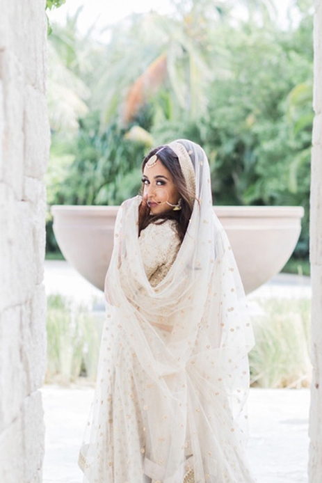 Komal was a Sabyasachi bride and wore an ivory lehenga from their Udaipur Collection to exchange vows on the beach in Mexico. The color was perfect for the sunny, outdoor ceremony.