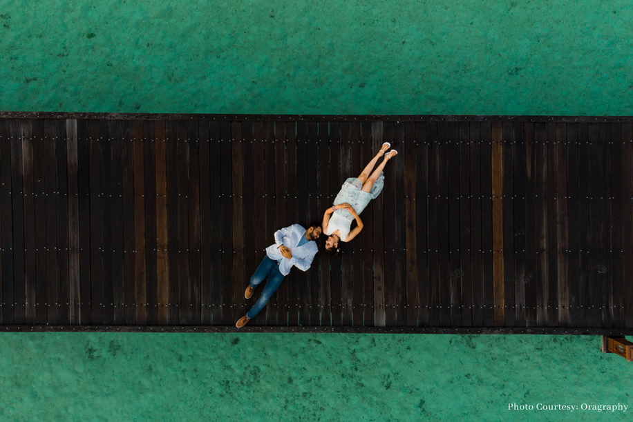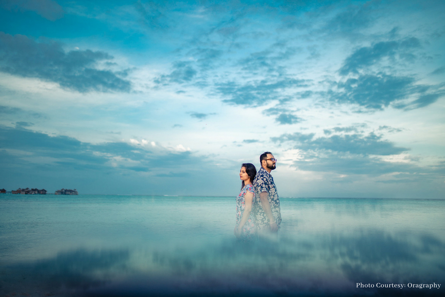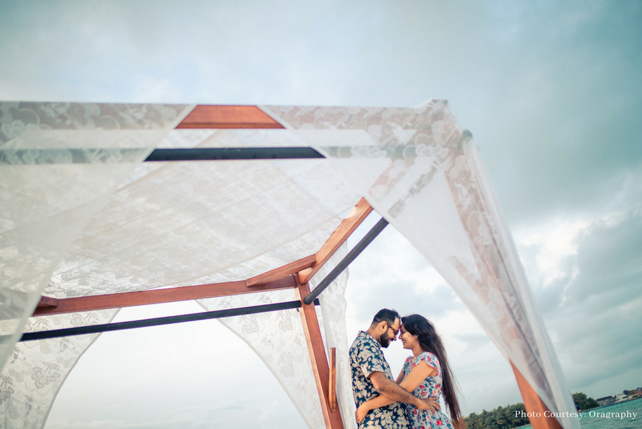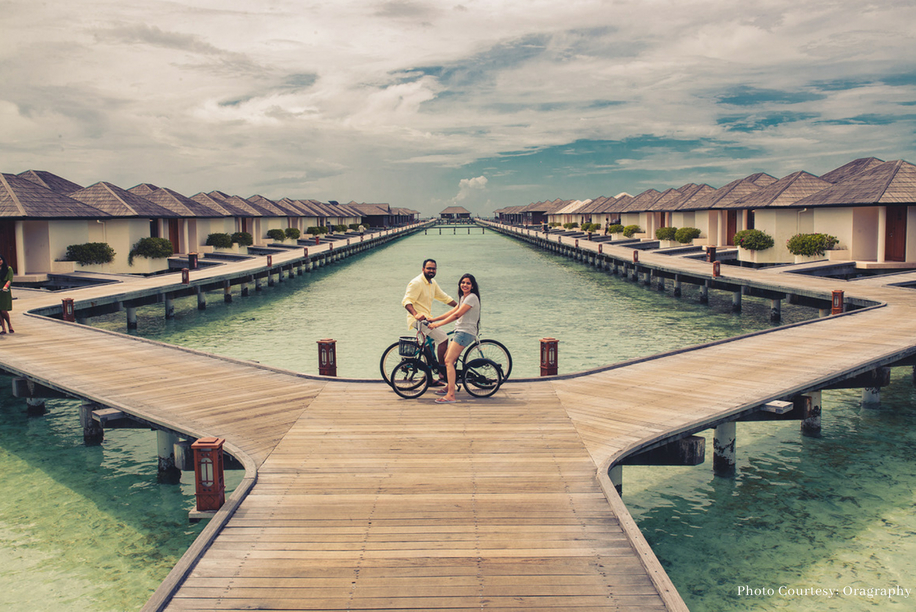 Team Oragraphy shot Ketan and Madhavi’s romantic pre-wedding photo shoot in the Maldives. The talented team of photographers says, “We got all chill on an island in the marvelous Maldives with Ketan and Madhvi. The Paradise Island Spa and Resort was our home for two days. The couple was a bit hesitant at first but love makes you do great things. Anyway, with the skies overhead, the sand and sea beneath, everything was a breath of fresh air. There was enough room to create a series of frames; a romantic candlelit set up on the beach, chasing each other over the sunsets, riding bicycles throughout the resort and getting that teenager in you to work out on the tennis courts. The shoot was fun. There were times when the sky went dark and hit us with a soft thunderstorm but we waited for that silver lining and we were rewarded with a stunning rainbow!”
