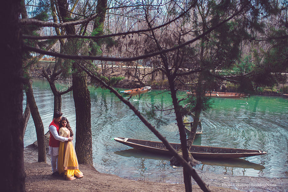 Imagine being in paradise on earth – in the garden of Eden that is Kashmir, holding each other as ancient, snow clad mountains stand sentinel in the backdrop or a lake sparkles like laughter. Ankita and Akash of WeddingNama are adept at bringing dramatic environmental elements into stunning frames.