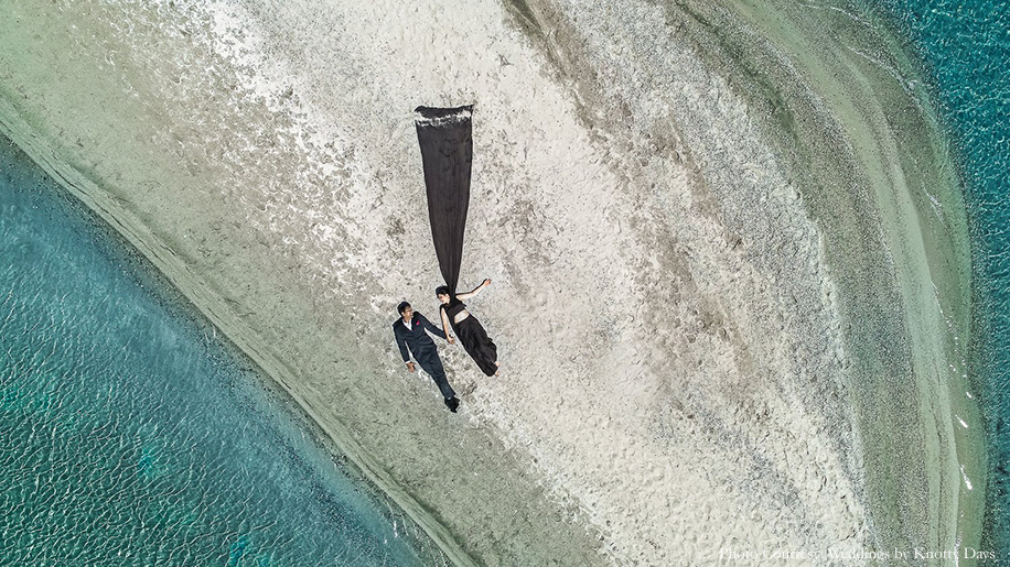 Giving a filmy twist to Vishrut and Niharika’s wedding shoot, Weddings by Knotty Days replicates the dramatic vibe of hit starry couple Shah Rukh Khan and Kajol through slick frames against the icy backdrop of Ladakh’s snow-clad mountains. The couple even wear ethnic ensembles for some of the shots making them seem like a page out of a romantic Bollywood drama. From silhouettes to top shots, closeups and stunning drone photos, the images do justice to manmade attractions like a pretty bridge as well as the mesmerizing natural beauty of Ladakh, especially the brilliant blue lake and its grainy, sandy shore that makes for a compelling backdrop for those ‘lying in the sand’ couple pictures.