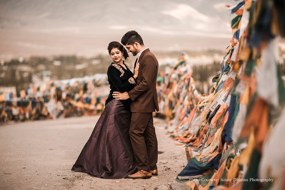 Whether it is shooting in remote locations or by some lush green patches of vegetation along the valleys formed by the perennial streams in Ladakh, Sunny Dhiman Photography always maintains his colorful aesthetic at each pre-wedding shoot. Apart from beautiful shots of Ashutosh and Bharti at Ladakh’s scenic locations, his images make for compelling viewing with their pops of color. After all, it is the little things that make a difference to the big picture.