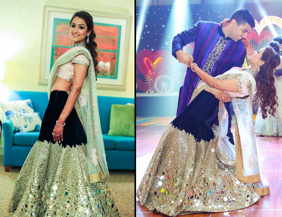 Perfect for the sangeet night, Serena’s black velvet lehenga by Jay Kumar Makhija with glamorous mirror work and a peach choli made a statement this year and is perfect for the modern Indian bride.