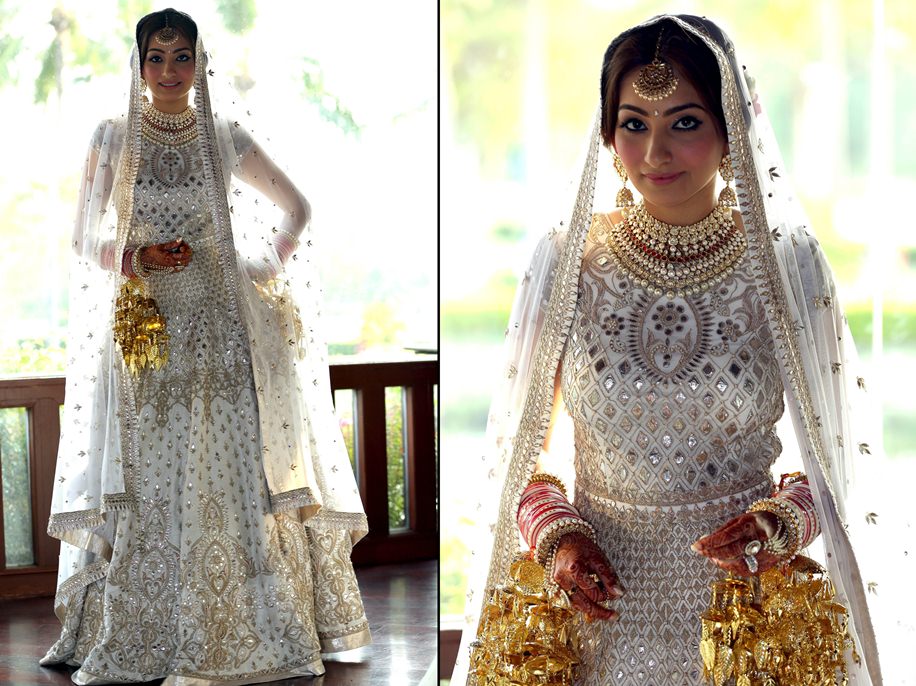 Ritu resembles a bride out of a fairytale in this pearl white lehenga with gota work from Anita Dongre’s Jaipur Bride collection. The look is completed with stunning kundan and pearl set from Pink City designed by Anita Dongre and crafted by Jet Gems.
