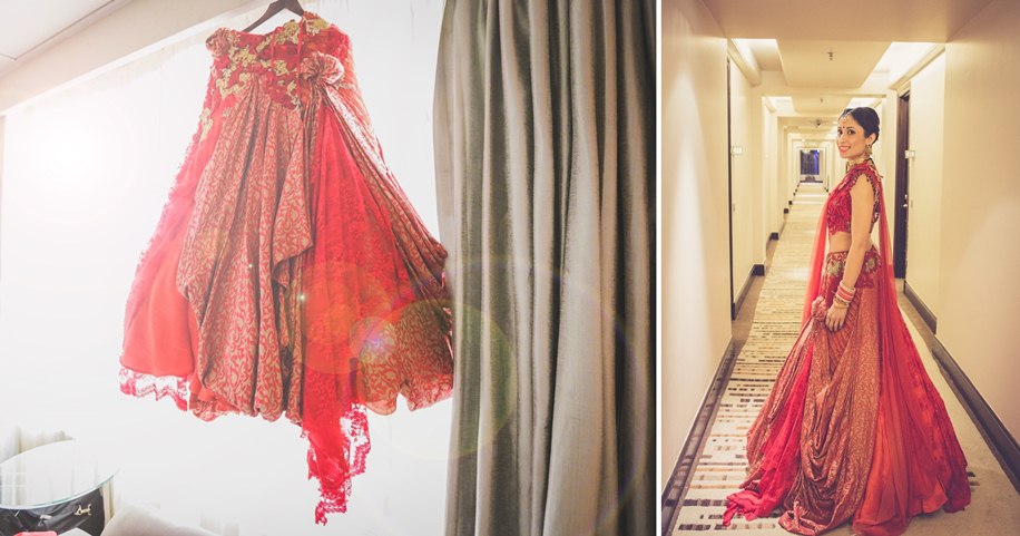 With symmetric layers of lace, self embroidered-silk and tulle, all held up and knotted to one side, Nivedita chose to go unique with her red and gold lehenga by Sulakshana Monga of Soltee.