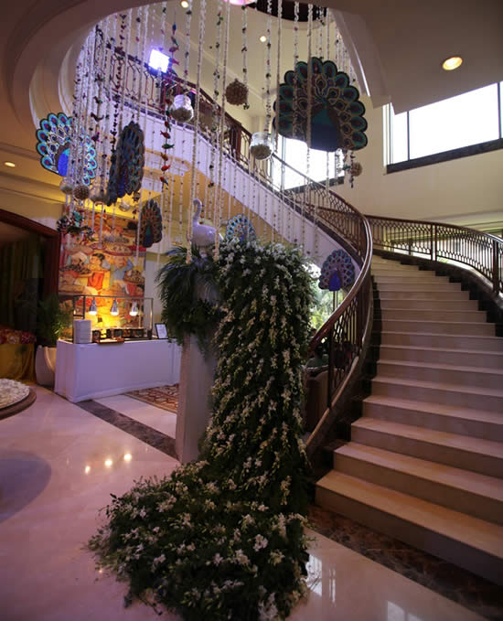 Devika Jain, daughter of the owner of theatre chain Inox Leisure Ltd married Mumbai based business tycoon Ambuj Chaturvedi. Here are the pictures of the Peacock theme decor at the Mehndi held in JW Marriott, Mumbai; and the Gold theme decor at the wedding at the Taj Lands End.