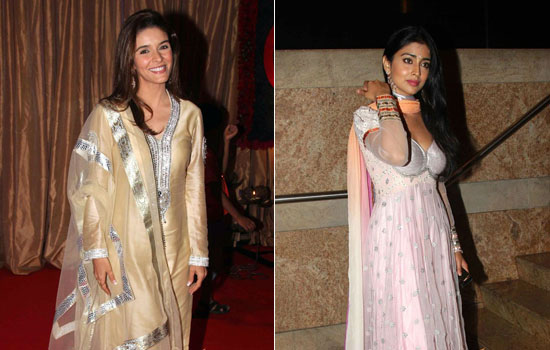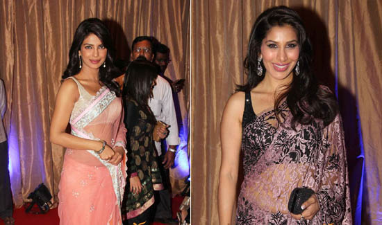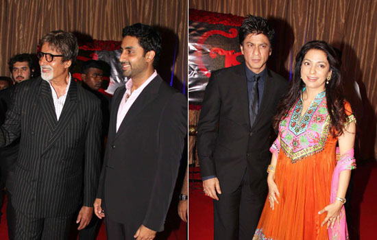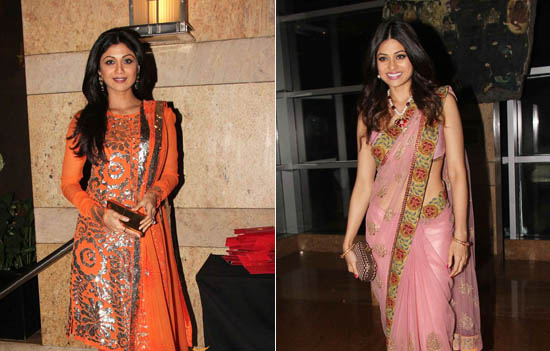 Abhishek and Amitabh Bachchan were there, and so was Shahrukh Khan. Shilpa Shetty came in a gorgeous orange Abu-Sandeep churidar kurta while her sister Shamita wore a pretty pastel Manish Malhotra saree. The other actresses present included Priyanka Chopra, Juhi Chawla, Rajeshwari, Shriya Saran and Sophie Chowdhary.
