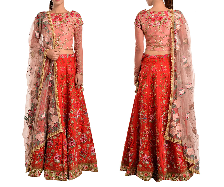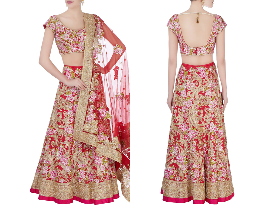 Red & Pink Floral Bridal Lehenga Set by Bhairavi Jaikishan