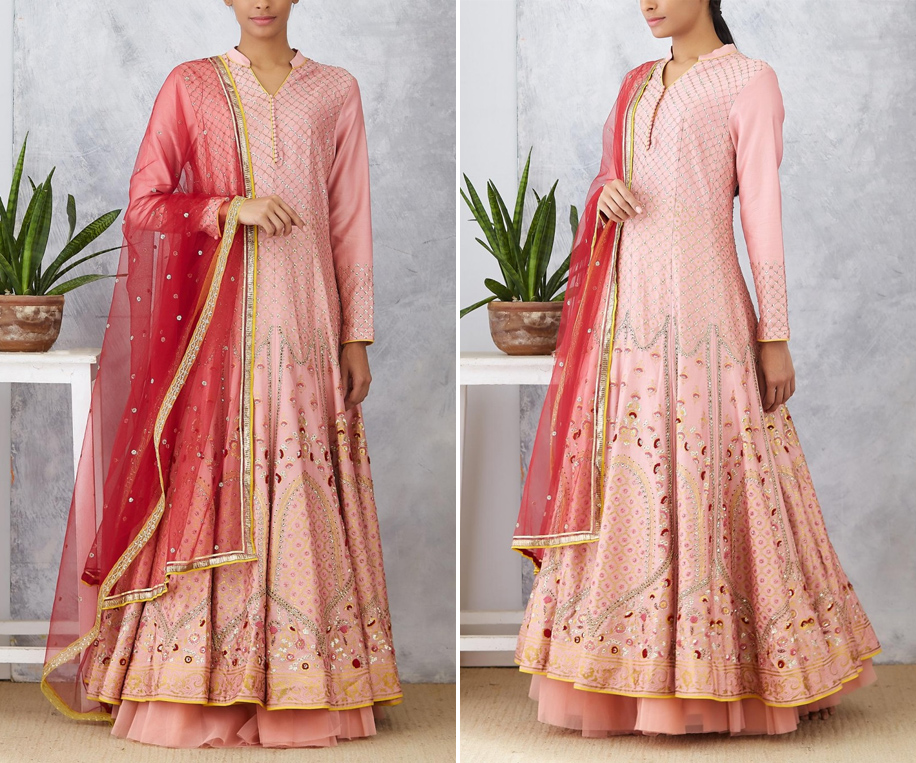 Pink and Red Kalidar Bridal Lehenga by Tarun Tahiliani