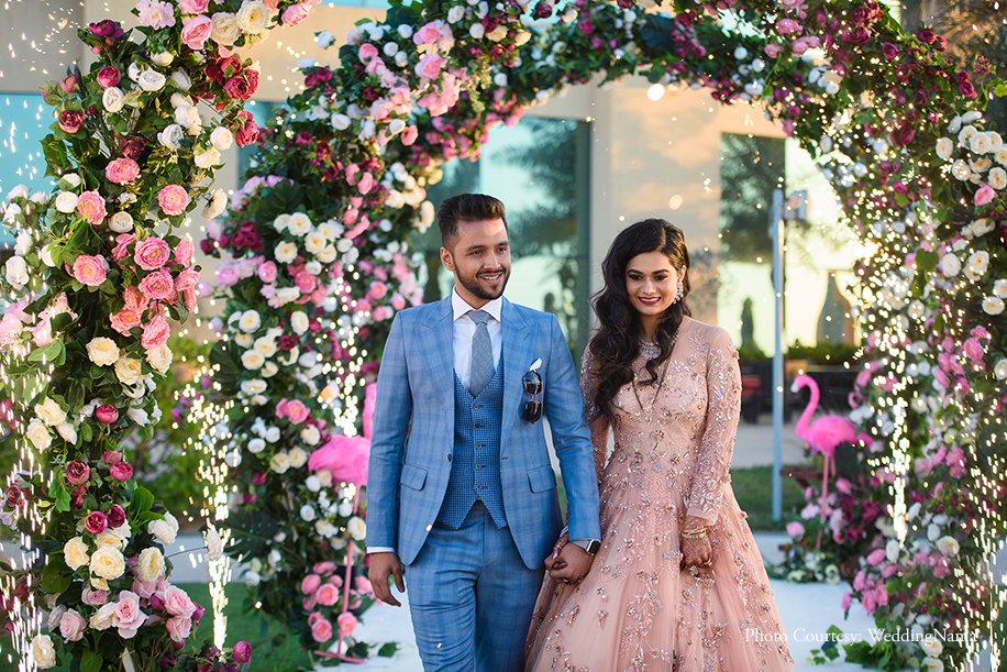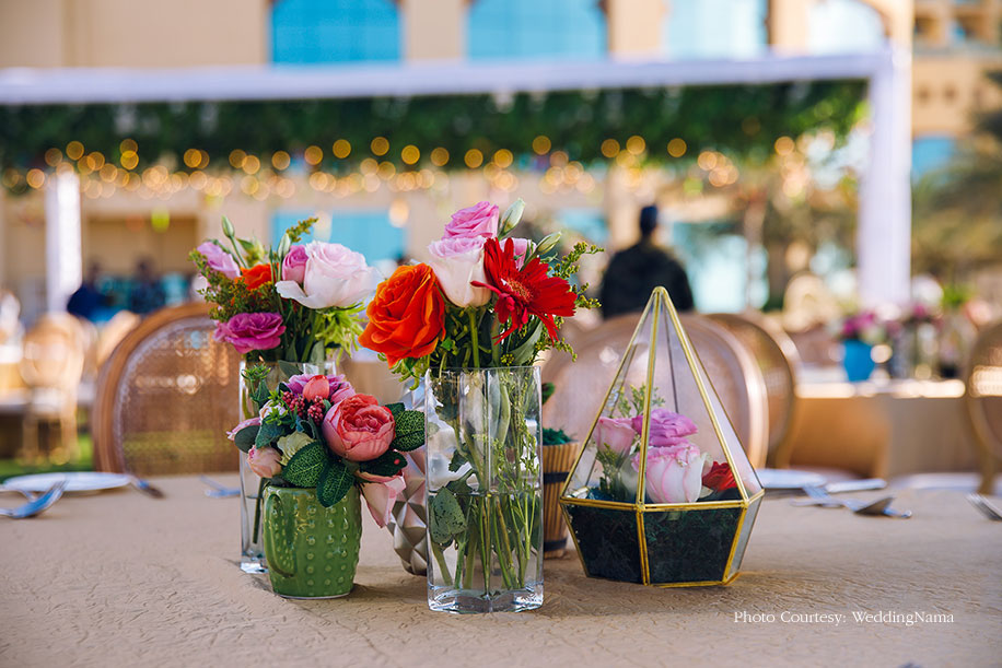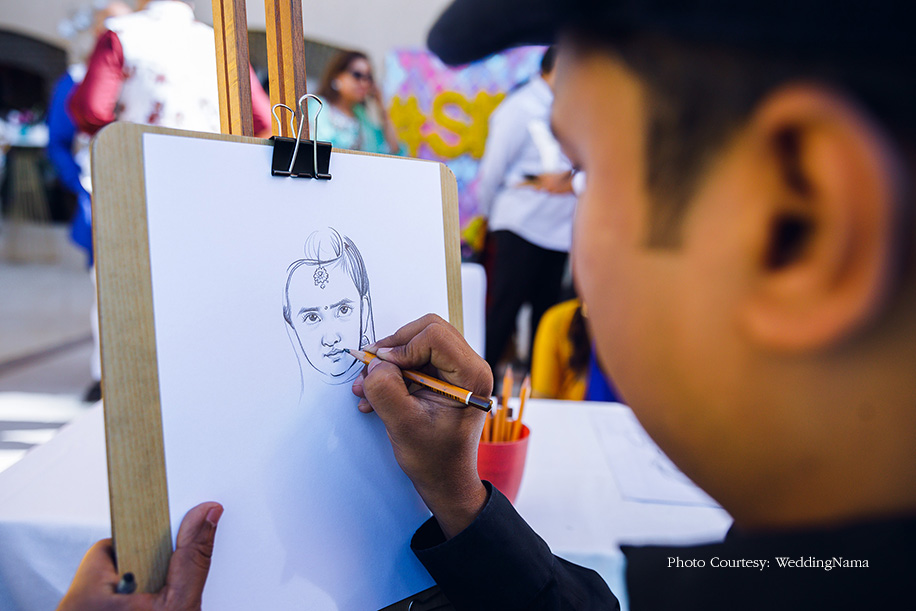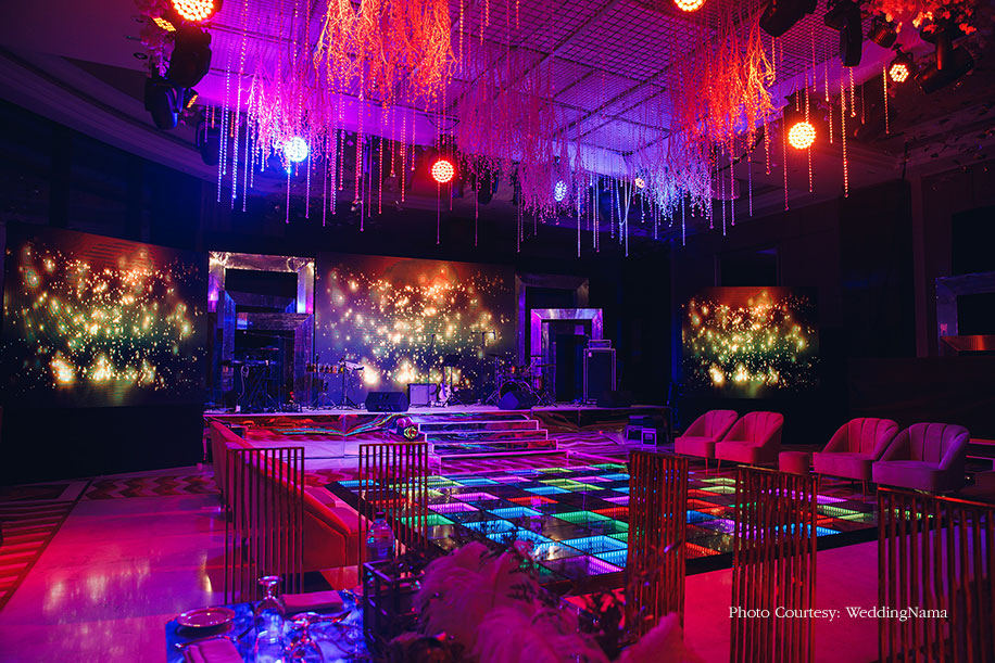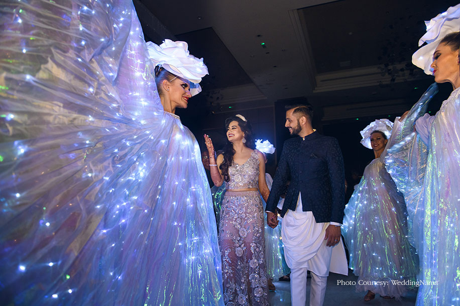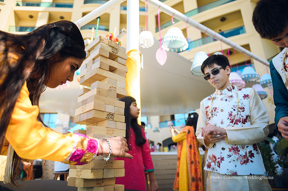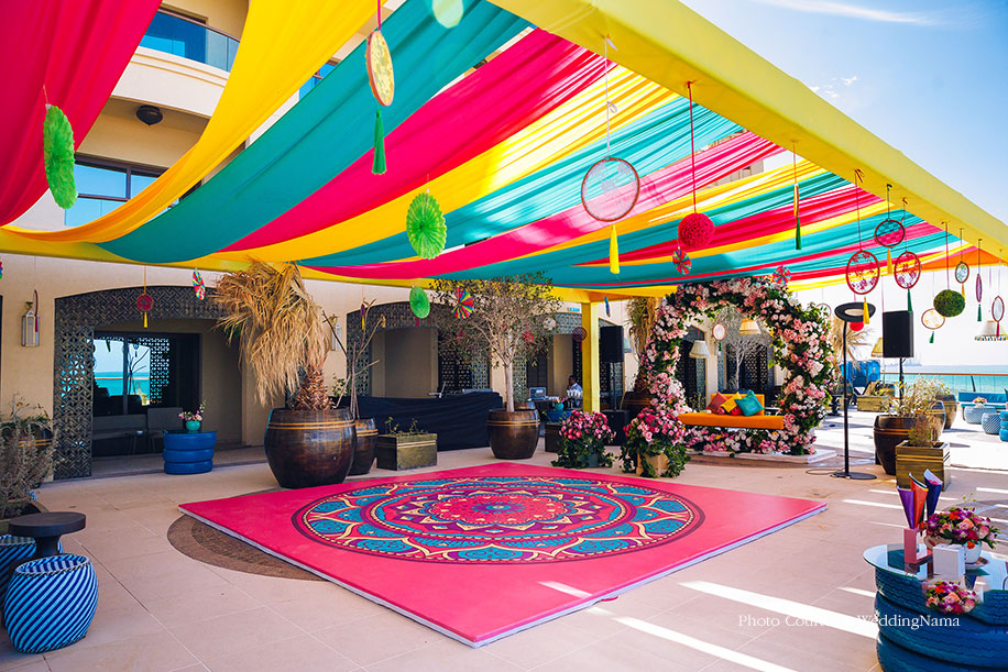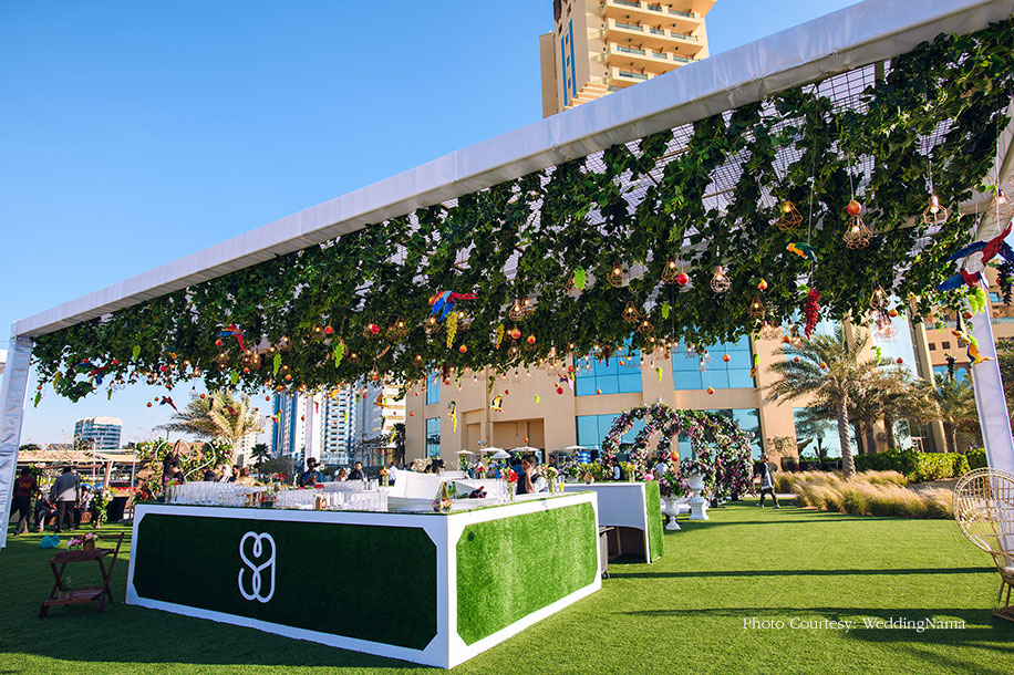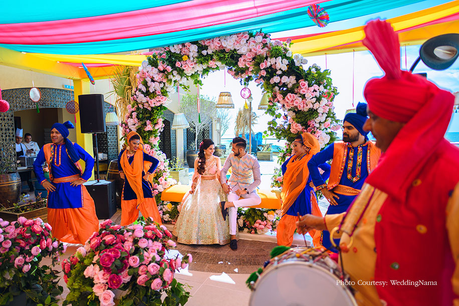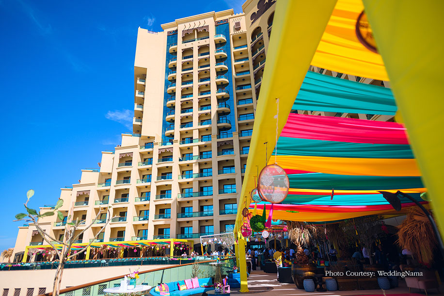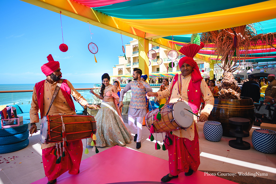 Achint Nag of Krayonz Entertainment shared some highlights of the three-day extravaganza. Guests from around the world were welcomed by Arabic dabke dancers. A boho-chic ocean front mehndi with vibrant decor elements such as drapes, flowers, and quirky props followed, where guests were entertained by Emcee Dilruba Pandey and DJ Taher. The couple entered in spectacular style accompanied by some desi dhol drummers and bhangra dancers, who later continued to entertain with various Bollywood performances. Games like Jenga, Digital Caricature Activity, and more keep everyone engaged.