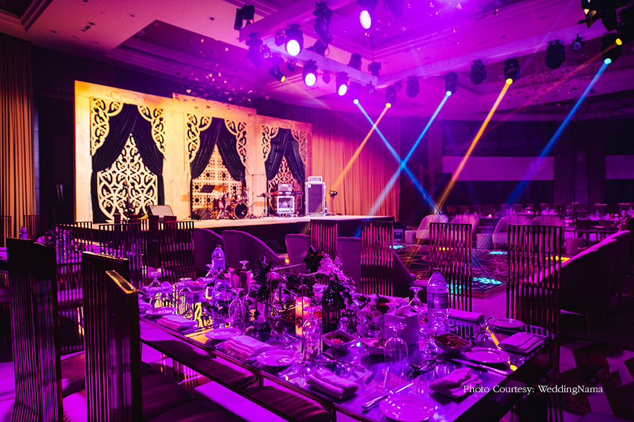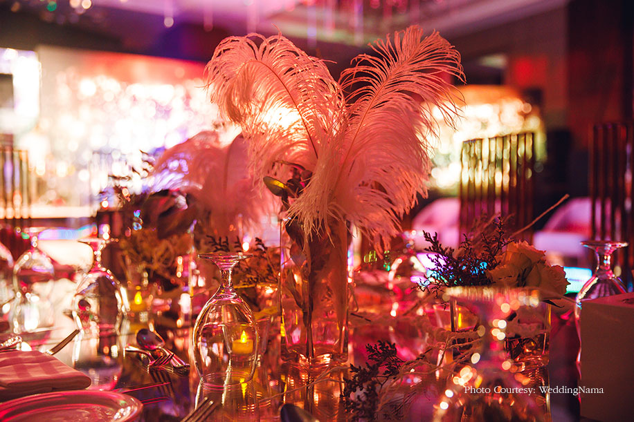 Next was the sangeet where everyone indulged in a night full of dance and celebration. Achint shares, “Krayonz Entertainment made various arrangements to ensure the comfort of guests, and our hospitality was appreciated by one and all! We started the event with a mesmerizing entry by internationally acclaimed LED dancers. The decor palette was white and included elements such as dainty floral arrangements, crystal chandeliers, elegant table settings, and an abundance of candles and candelabras casting their warm glow over the proceedings. Ambilli Menon made the evening memorable with her musical talents, after which DJ Taher got the party going. The skilled bartenders of Drinq added touch to magic to the function.”