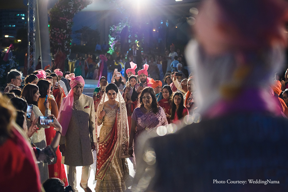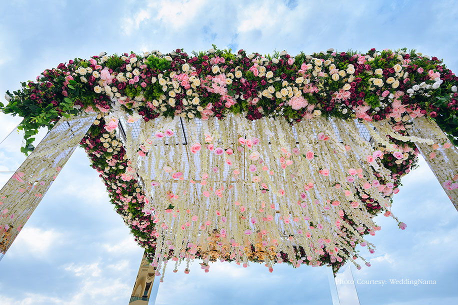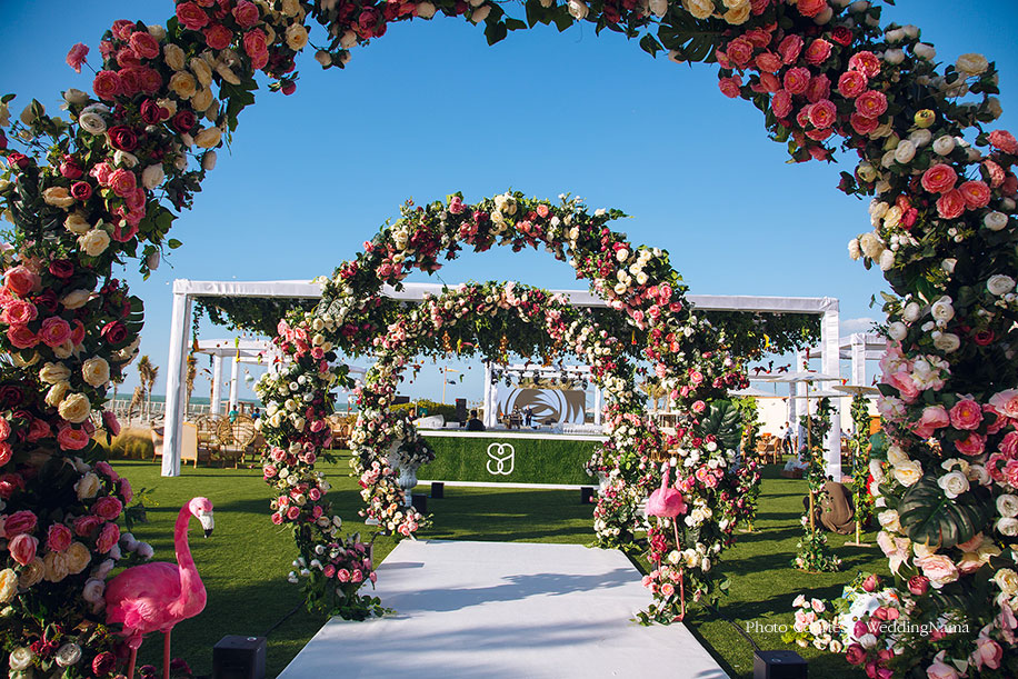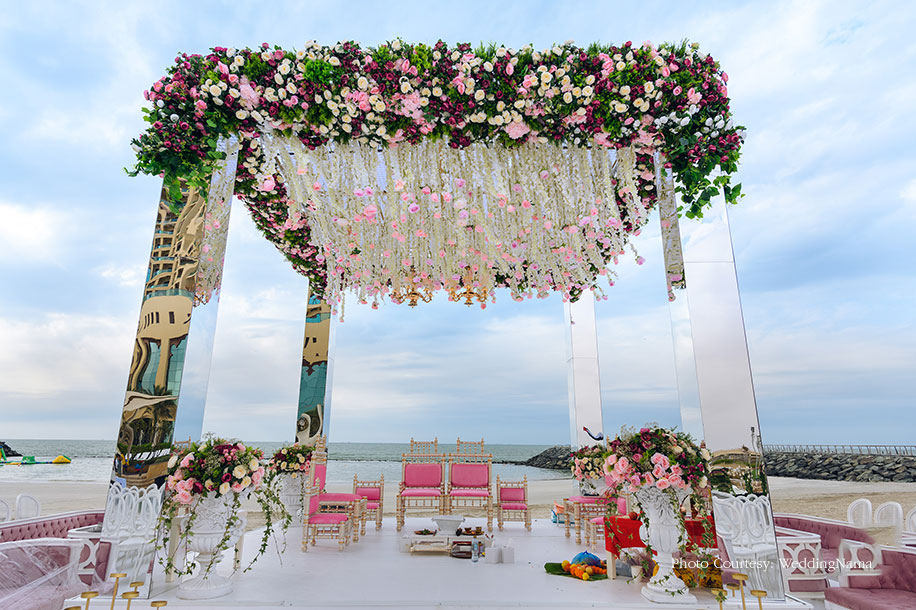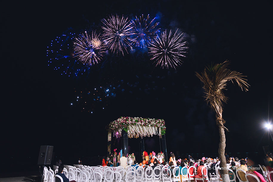 The next day saw pre-wedding rituals such as the ‘Safa Bandhai’ ceremony which was followed by the baraat procession. The groom made an entry accompanied by his loved ones dancing to the beats of desi dhol and DJ Taher in a DJ Truck. The beachside ceremony saw ethereal white decor and seating punctuated by lush foliage elements and exotic blooms. The elegant ivory aisle lead up to a mandap of mirrored pillars topped by a canopy of colorful flowers and leaves that looked magical against the backdrop of the blue sea. Simran looked stunning as she walked down the aisle with her parents. Dazzling fireworks marking the union of the couple left everyone enthralled.