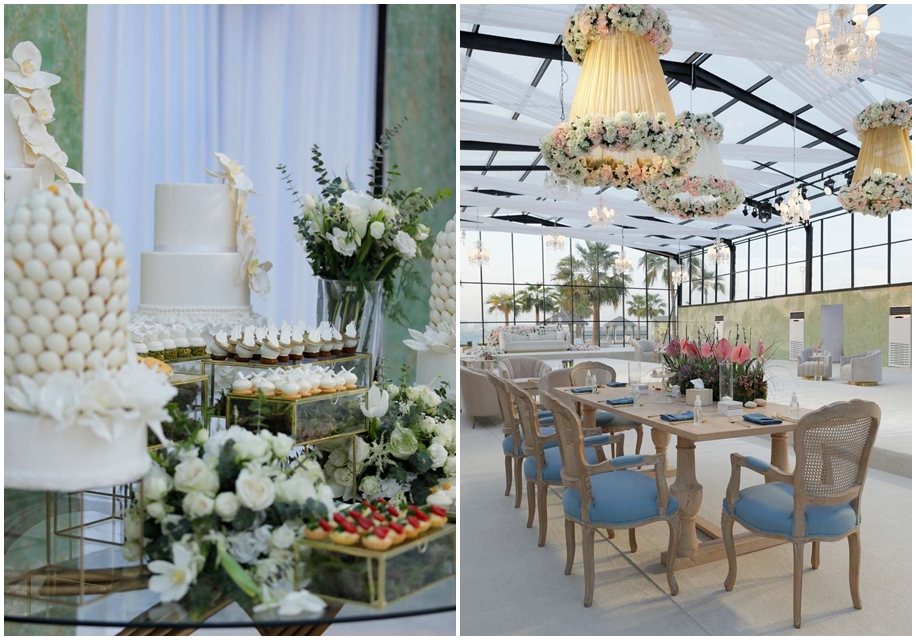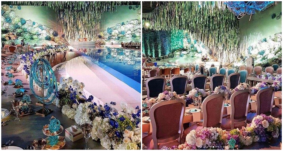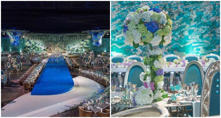 1. Inspired by the cool hues of the ocean with royal blue, turquoise, and other shades of blue dominating the color scheme, this royal Qatari wedding was a picture of elegance. Every detail was of utmost importance as even the waiter’s waistcoat buttons aligned with the theme. Fresh white orchids and blue, green, and white hydrangeas were used in the flower arrangements and main centerpieces.