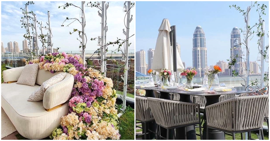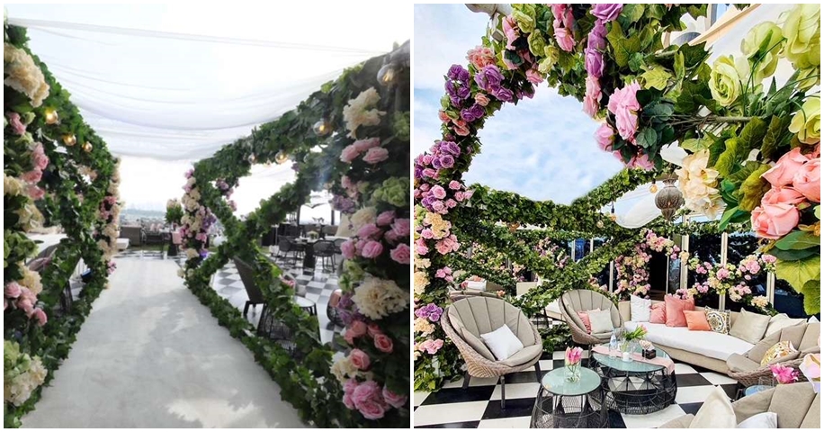 7. If vibrant hues and fresh blooms with a touch of contemporary elegance are the factors you look for in your wedding decor, then this alfresco wedding in Qatar is right up your alley! With arches of purple and white blooms intersecting each with a monochrome floor to balance the array of colors – this wedding was carefully designed to give maximum sensorial pleasure! Plus, the array of cakes and macarons only made the celebrations all the more sweeter.
