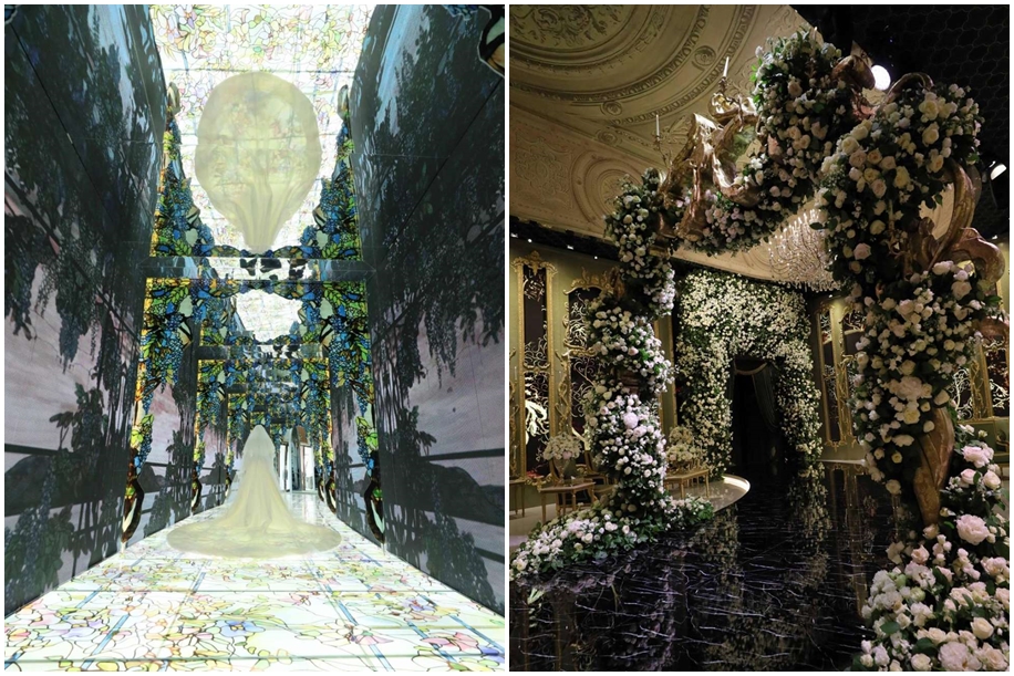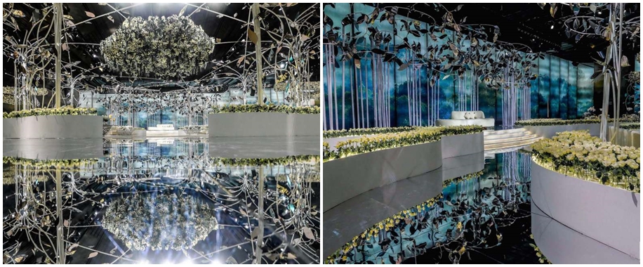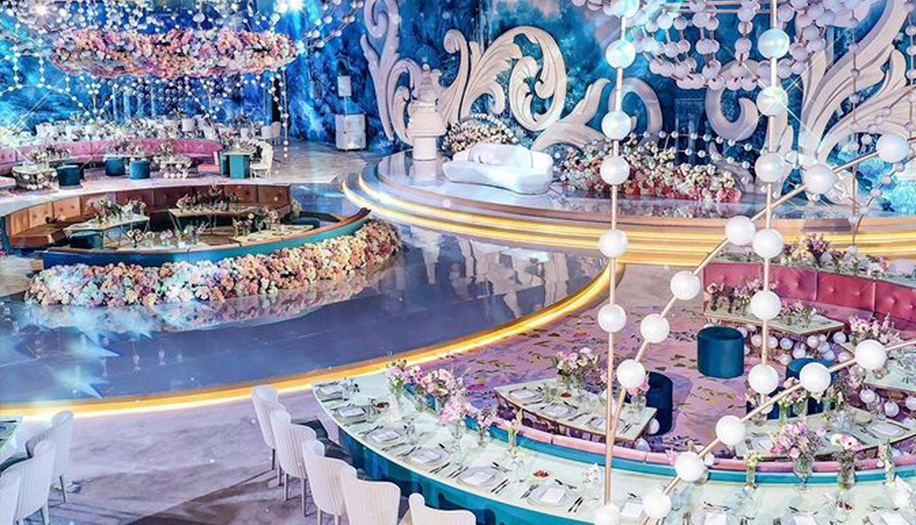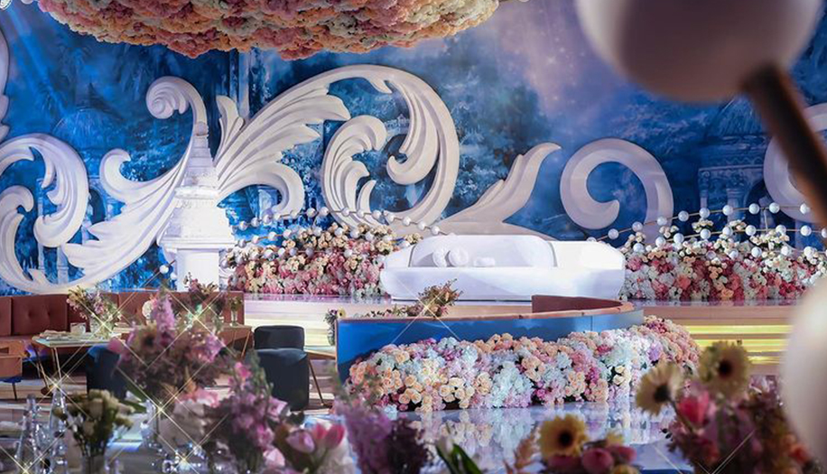 2. Exuding equal parts elegance and opulence, this wedding in Qatar will steal your hearts with its stunning ivory and chrome design. Brimming with white blooms, a chrome stage, and a canopy of metallic leaf-shaped chandeliers accentuated by LED screen backdrops that gave one an impression of being outdoors – this wedding was an absolute stunner!