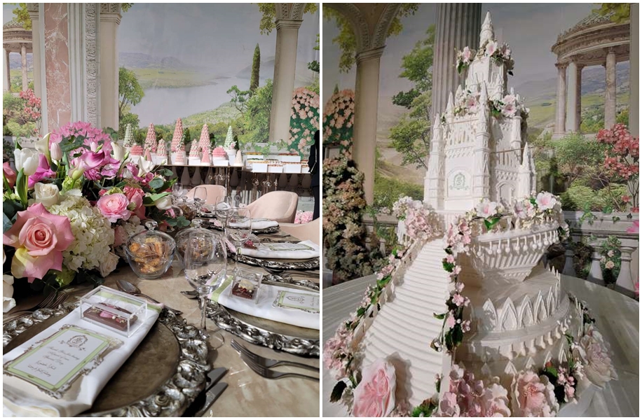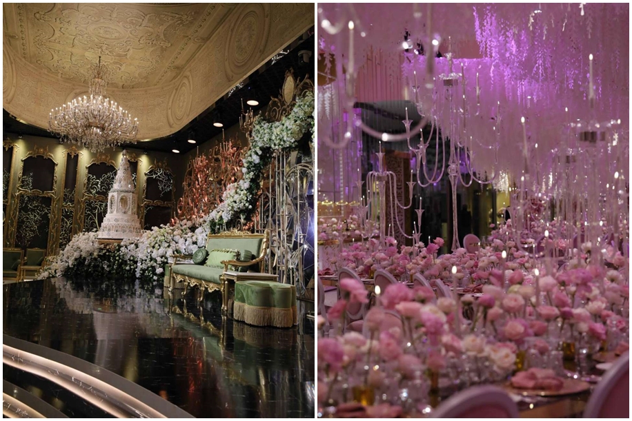 8. Decadent details, lush blooms, and rich jewel tones – this wedding in Qatar had it all! A stained glass aisle mesmerized the eyes while fragrant pink blooms made the celebrations resemble a fairytale. Intricate crystal chandeliers and a huge cake paired with olive green furnishings completed the opulent decor.