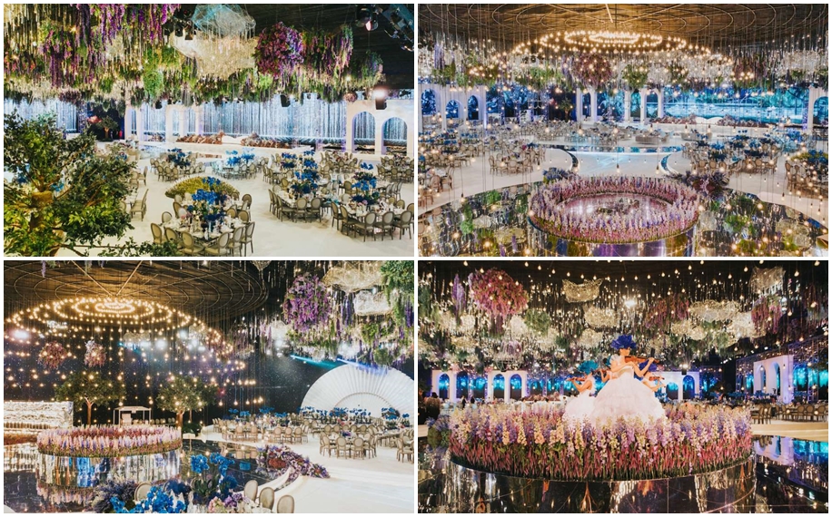 3. Making the most of the vast indoor space to create a whimsical garden that resembles a midnight dream, this royal Qatari wedding is perfect for couples who love everything larger than life. Innovative lighting reflected off the chrome floor, live musicians, tropical blooms, an abundance of colors, and intricate floral chandeliers had everyone awestruck.