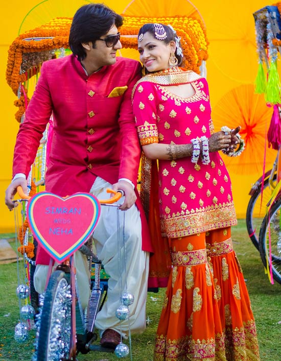 The Mehndi ceremony was a lovely laid-back afternoon, with a pop-kitsch theme at the bride’s private farm in Pushpanjali. Neha wore a sharara designed by Nidhi Tholia.