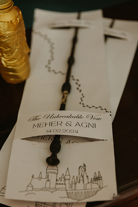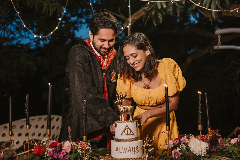 Ardent Harry Potter fans to their very core, Meher and Dr Agni Kumar Bose have known each other since school. However, as fate would have it, they reunited and fell head over heels in love. And, when it came to popping the question to Meher, Agni just had to make it special with a Potter-themed proposal orchestrated beautifully by WeddingSutra Favorite – The Vow Weavers.