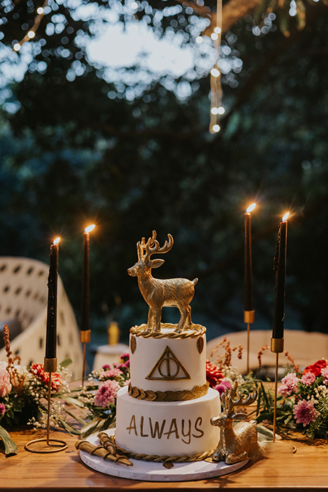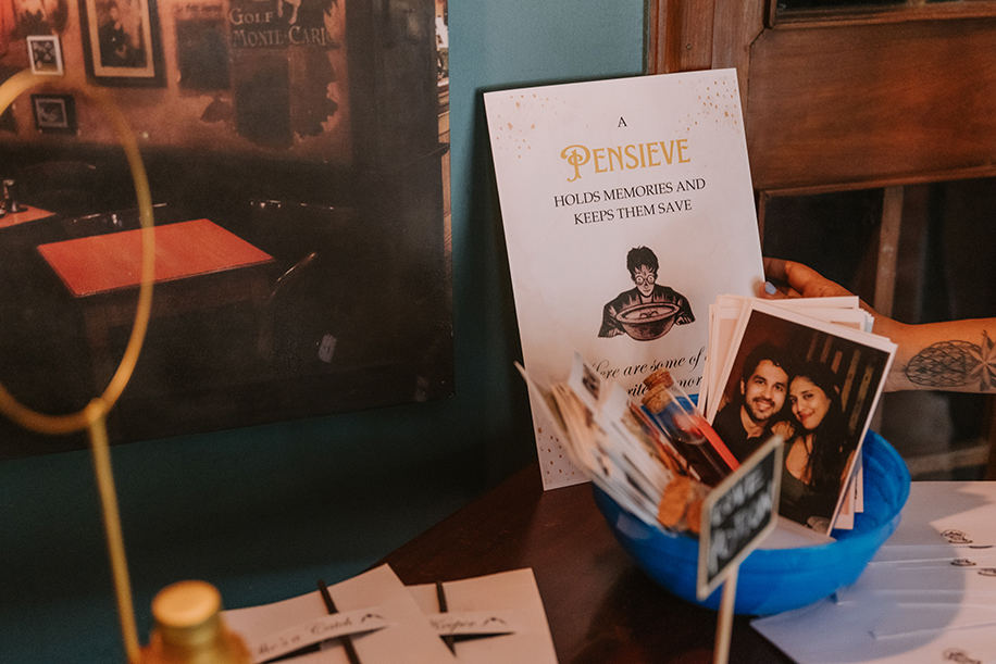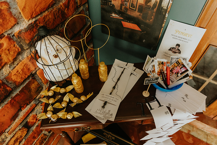 With the plan in motion, Agni set about finding the perfect photographers to capture their wedding proposal. He chose The Vow Weavers who impressed him with their enthusiasm and professionalism. Agni shares, “The only idea that I had thought of till I went to The Vow Weavers was having the Golden Snitch as the ring holder. The way they coordinated everything from decor, photos and videos to even doing an on-site recce of the villa to get all the measurements; this level of dedication was so heartening to see and experience.” The decor included polaroids of the couple along with several elements that were in sync with the theme. Harry’s owl ‘Hedwig’, the sign of the Deathly Hallows at the entrance, a Poké Ball and heartfelt messages suspended from the ceiling surprised Meher as she entered the venue.