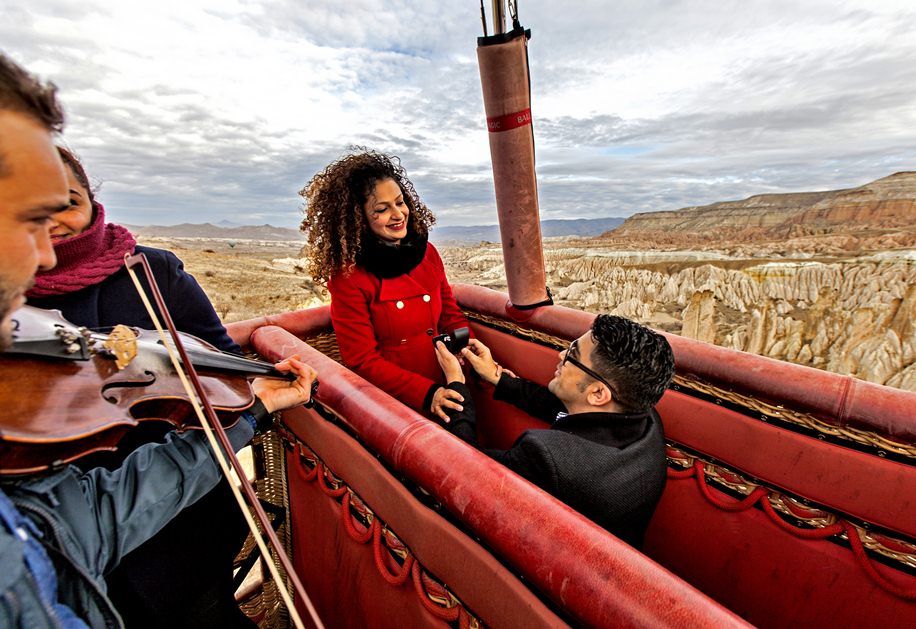 This wedding proposal shoot was ingenious in the way it captured a small space creatively and spatially – without missing a detail, be it clear close-ups of the ring, bouquet handover, loving hugs, passionate kisses, stunning backdrops, surprised expressions and even obligatory shots with the talented Turkish violinist.