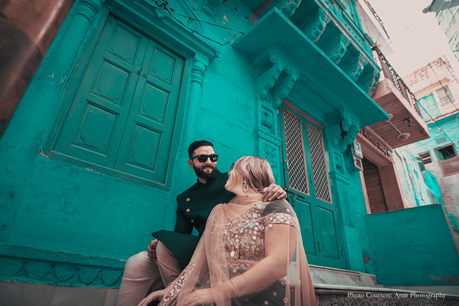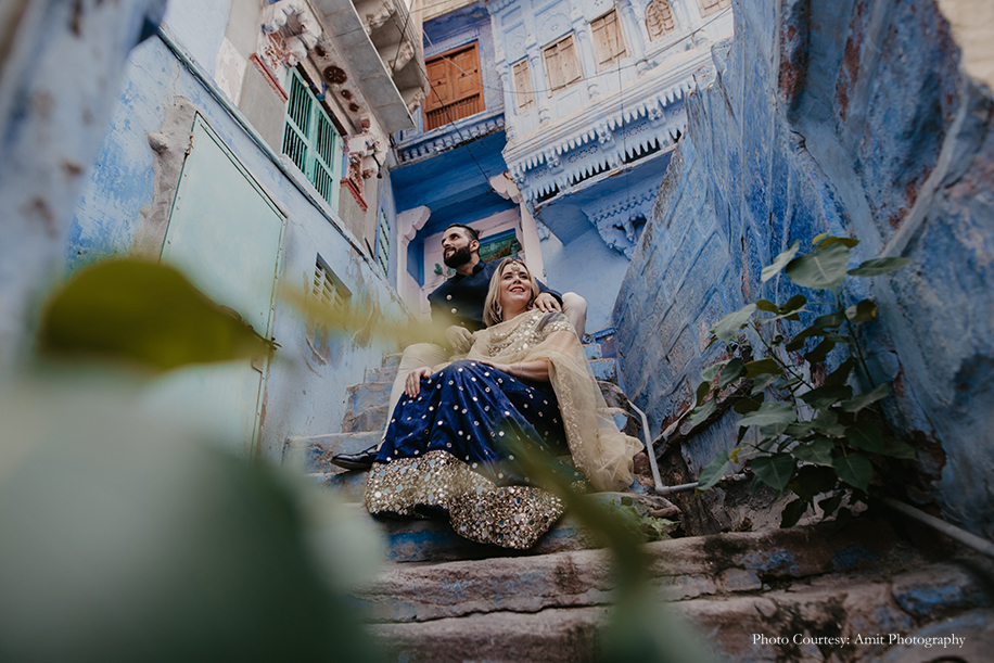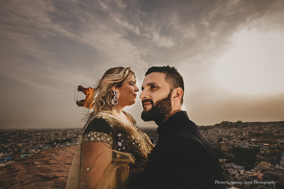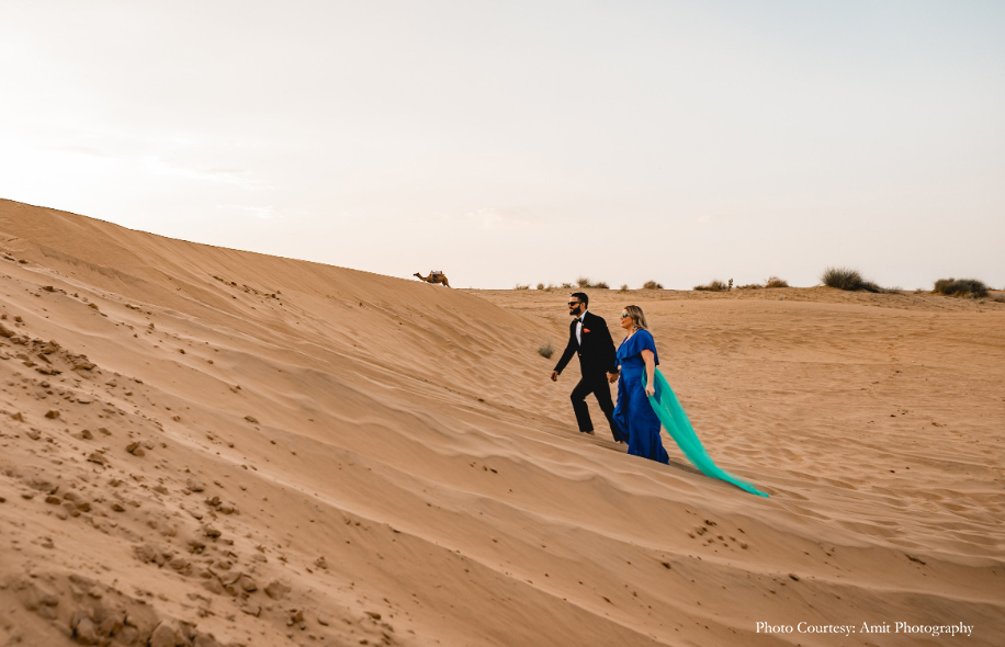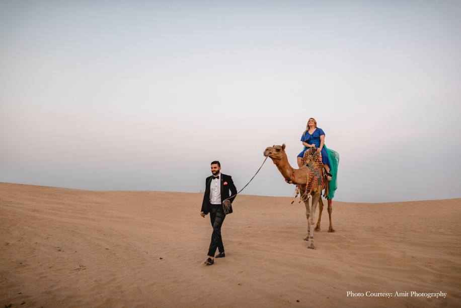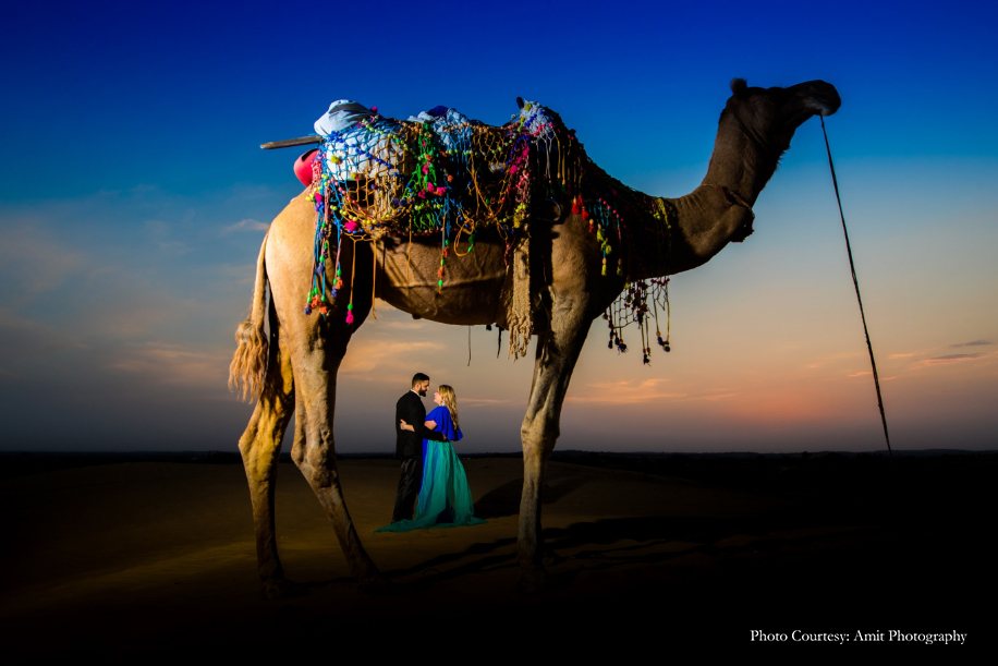 Bride-to-be Megan says, “We wished for a fun, romantic and unique shoot, and to help us with that, Manish struggled to find the right photographer until he came across Amit’s work! His skill and unmatched artistic vision amazed us the most. Both Manish and Amit decided upon the culturally rich city of Jodhpur as the location for our shoot. And while they handled the logistics, I was in charge of the styling! Our wardrobe for the shoot included both ballroom formal and Indian attires for which, we rented outfits from Flyrobe. While the entire experience was amazing, the biggest challenge we faced was climbing the streets of The Blue City! However, with pristine sands, clear skies, and glorious heritage, the city sure did make for a stunning backdrop. We enjoyed the camel safari and got some remarkable shots during that as well! Further, I believe things wouldn’t be as great without Amit, keeping in mind the vision which we had which Manish and I aligned with his fantastic array of ideas.”