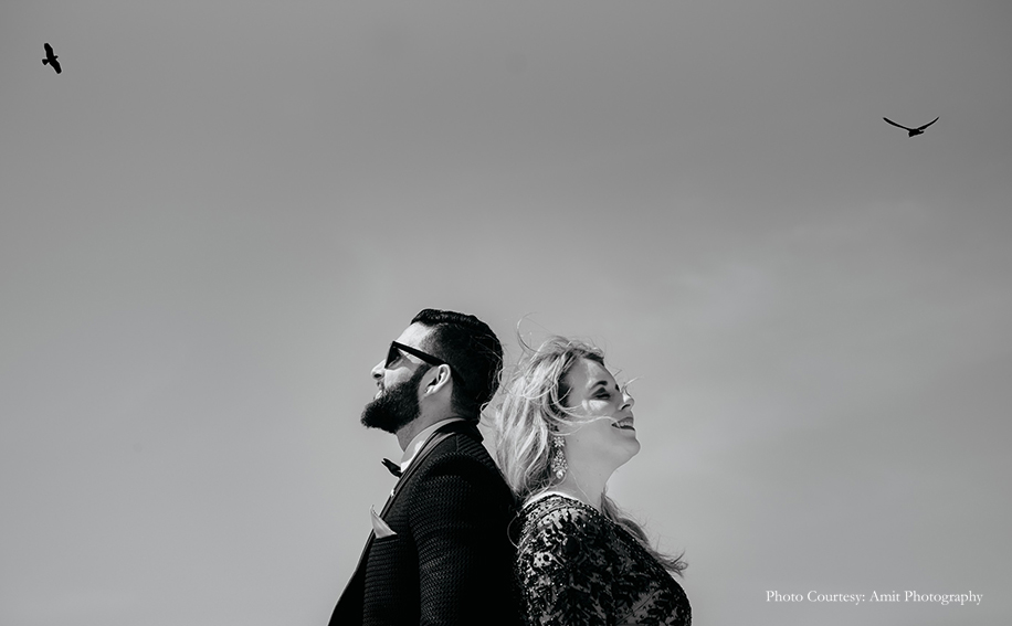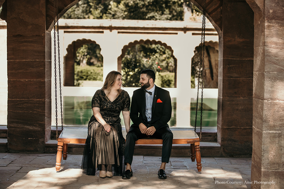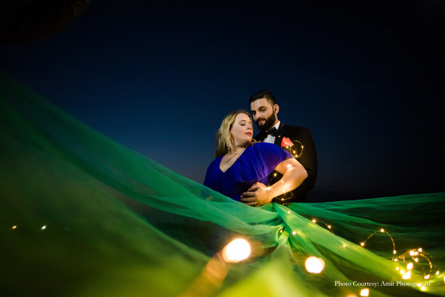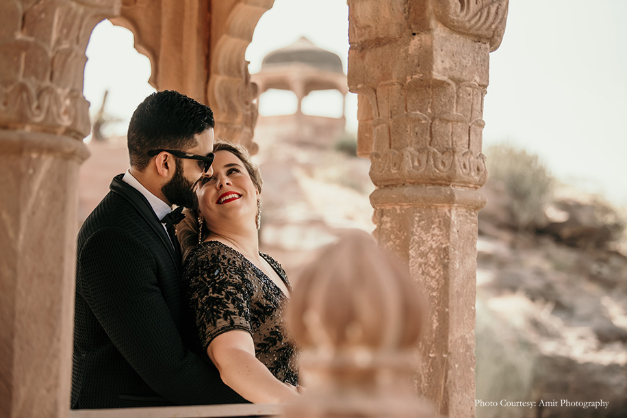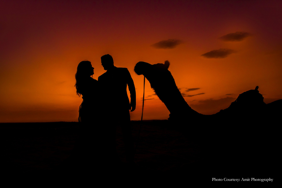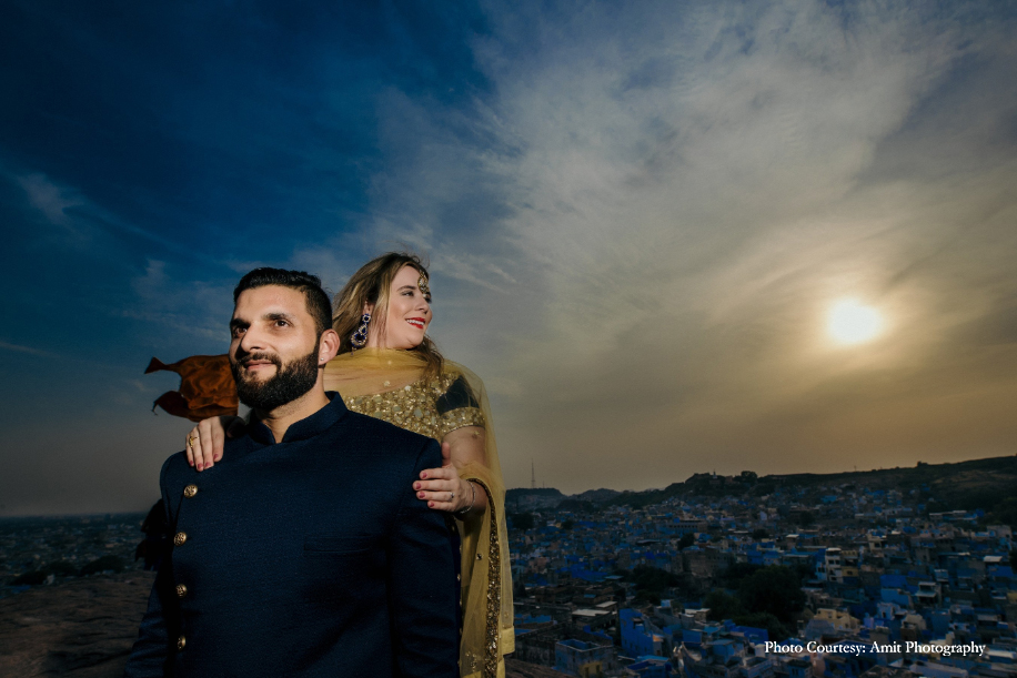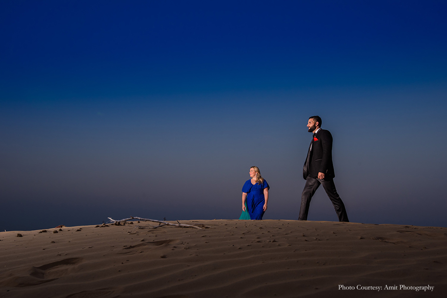 Bride-to-be Megan says, “We wished for a fun, romantic and unique shoot, and to help us with that, Manish struggled to find the right photographer until he came across Amit’s work! His skill and unmatched artistic vision amazed us the most. Both Manish and Amit decided upon the culturally rich city of Jodhpur as the location for our shoot. And while they handled the logistics, I was in charge of the styling! Our wardrobe for the shoot included both ballroom formal and Indian attires for which, we rented outfits from Flyrobe. While the entire experience was amazing, the biggest challenge we faced was climbing the streets of The Blue City! However, with pristine sands, clear skies, and glorious heritage, the city sure did make for a stunning backdrop. We enjoyed the camel safari and got some remarkable shots during that as well! Further, I believe things wouldn’t be as great without Amit, keeping in mind the vision which we had which Manish and I aligned with his fantastic array of ideas.”