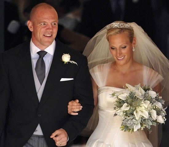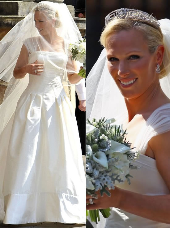 Sportswoman and British royalty Zara Philips, daughter of Princess Anne married England rugby captain Mike Tindall at Canongate Kirk in Edinburgh on July 30, 2011. Zara surprised the fashion world by choosing a wedding dress designed by her grandmother the Queen’s favourite couturier, Stewart Parvin. Zara wore an ivory silk faille and duchess satin gown with intricate lace detail, a 2.7 metre train and an ivory satin bodice. She accessorised the dress with The Meander Tiara, lent to her by mother Princess Anne and opted for Jimmy Choo shoes. She also sported a fine silk tulle cathedral length veil with a short blusher. This was held in place with a dazzling Greek tiara– a gift from her mother. Zara’s hair was pinned into a chignon by Evangelos Tsiapkinis at Michael John. Enhancing her natural looks, subtle make-up was applied by the team at Bobbi Brown.