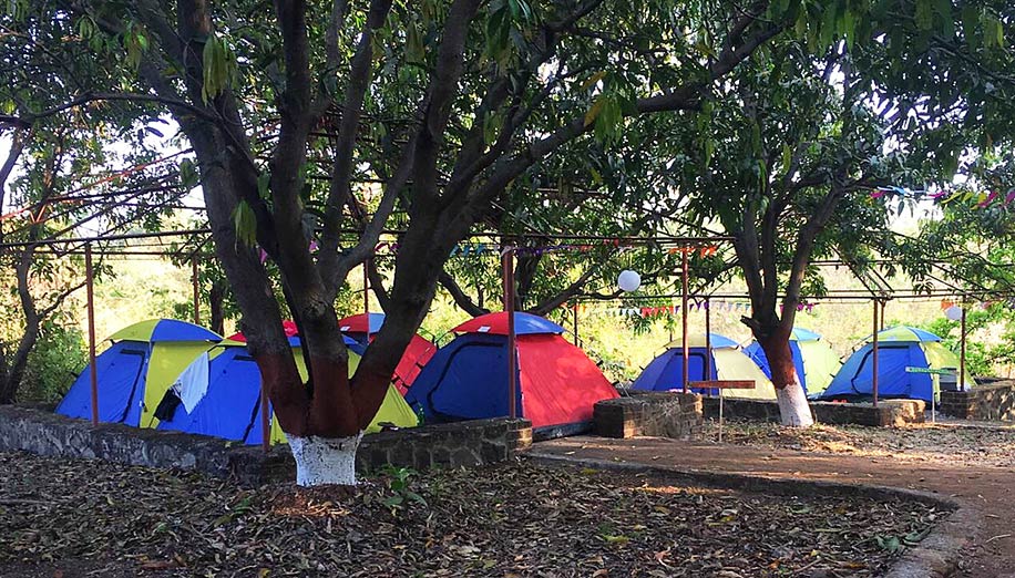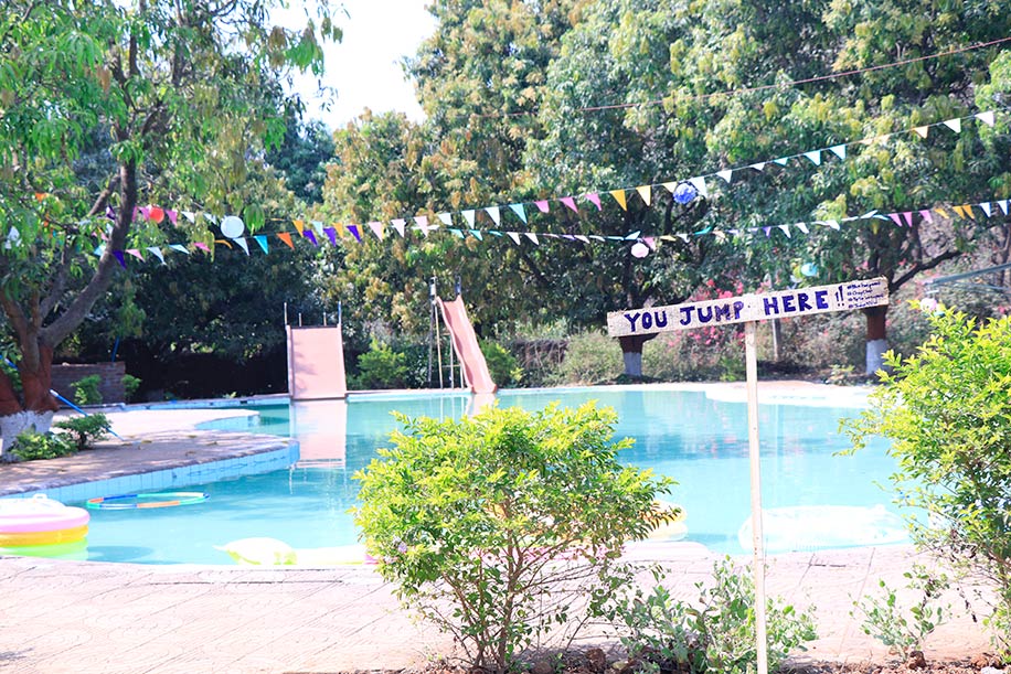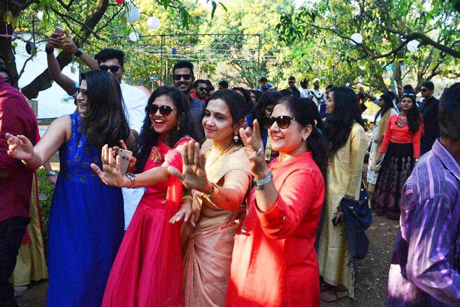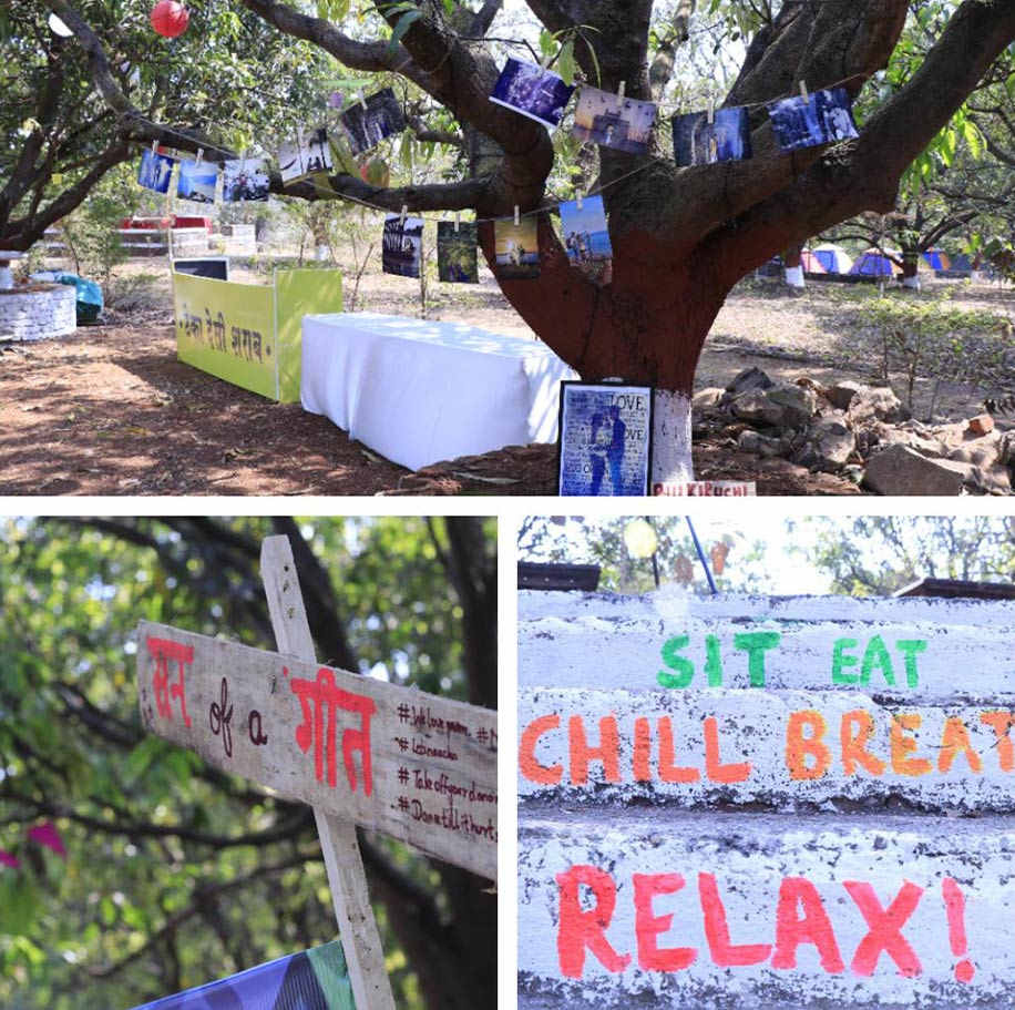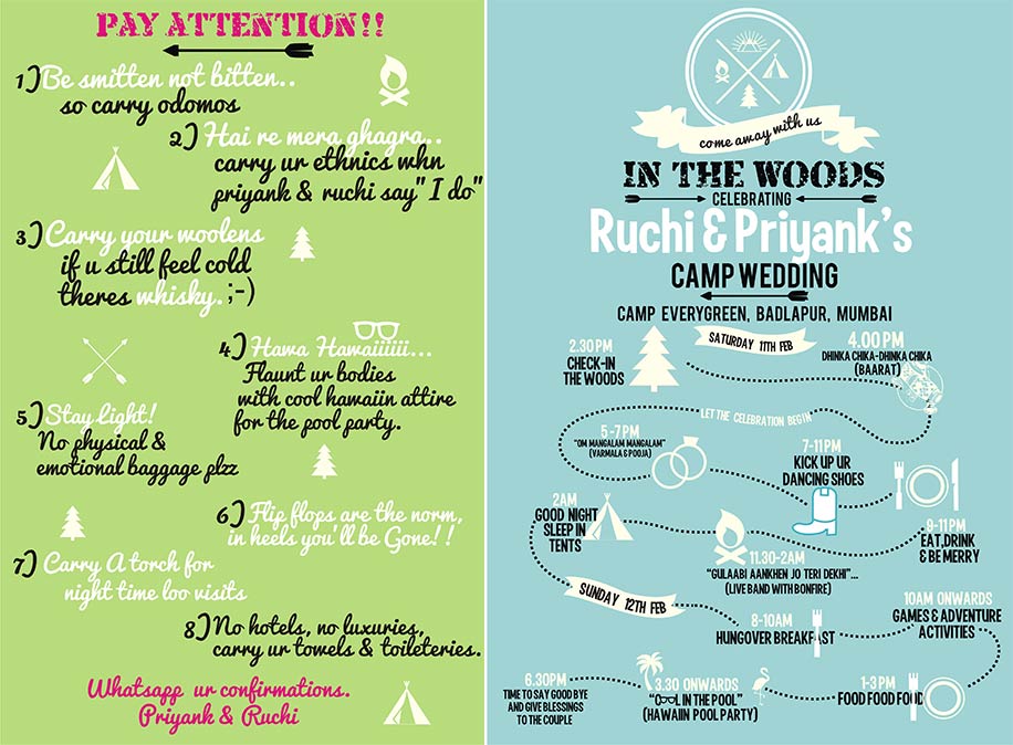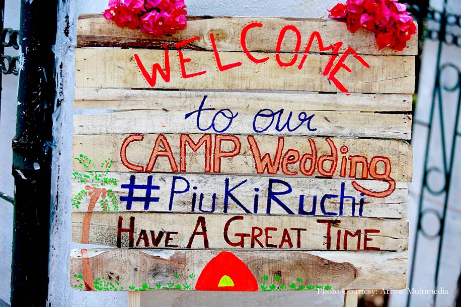 Set amidst the serene and lush wilderness on the banks of Barvi river in Badlapur, Camp Evergreen was beautifully decorated and wedding set-up that was predominantly traditional. “It was a total DIY wedding. Seven of my closest friends with hidden talents and interests (got to know the talents during the preparations) made for a kickass wedding-planning team along with the two of us. It started 10 days before the big day, with the décor shopping. We shopped a lot at Crawford Market in Mumbai and got varied lights, accents, décor, inflatables, and props for parties. Two days before the event our wedding squad, a couple of electricians and decorators from the nearby village and approximately 10-12 local villagers started setting up the place. We did it all, right from pitching the tents to putting lanterns, fairy lights, setting up counters and beautifying the place. Some of us were climbing trees to put up lights and décor, some were busy decorating the wooden placards. Someone was guiding villagers to clean up and others helped the local decorator to put up the mandap. For all of us, it was the most enriching experience of our lives.”