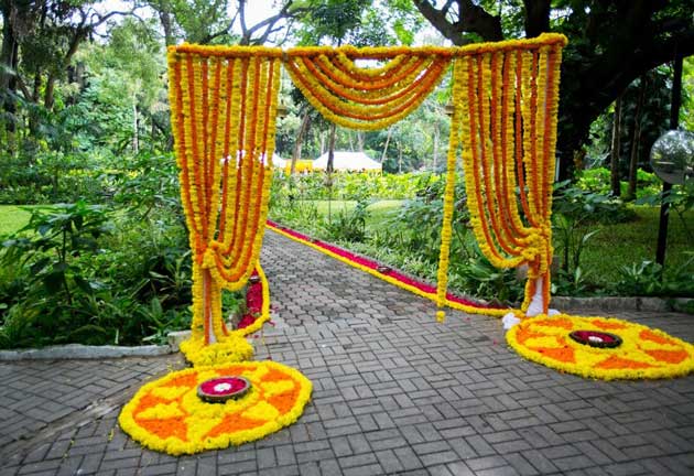 “We at Wedding Tales love working with the Taj Group and Taj West End (TWE) in particular. It is by far the most beautiful outdoor wedding venue within the city. Priyanka and Tarun’s wedding was a whirlwind for us as we were brought in only 8 days before the actual wedding. Once we heard that the wedding & reception will be happening at TWE we were relaxed. The Prince of Wales Lawns (POWL) at TWE is an easy venue to decorate, and makes for an amazing setting and all colors go with the scenic surroundings. Since it was a day wedding ceremony we used a lot of marigolds as well as bright red roses. White china canopies for shade and white chair covers with bandhini fabric. Priyanka wanted to walk down an aisle and since it was the hot month of June, we covered the aisle with rows of marigold. We also made hand-made paper cones filled with flower petals for guests to shower the couple.