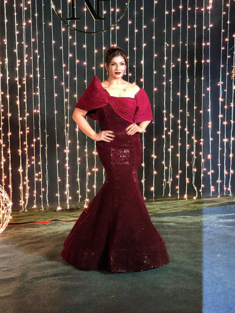 While Kajol looks resplendent in a Manish Malhotra saree, Raveena Tandon arrives in style in a red Taneiya Khanuja gown.