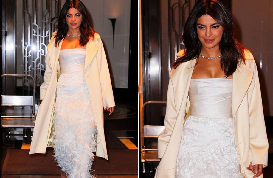 Looking like a vision in ivory silk, the bride-to-be wore a strapless cocktail gown by Marchesa featuring an organza bodice, ivory threadwork and feather textures. Priyanka was seen showing off her engagement ring from her fiancé and not to miss the dazzling diamond necklace and earrings (worth over a whopping $1 million) from Tiffany & Co.