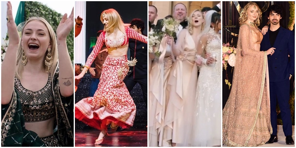 The couple’s wedding celebrations began with the Christian wedding where Sophie Turner was spotted in a gorgeous peach gown by Ralph Lauren, worn by all the bridesmaids. The dress was wrapped around the waist and bore 3D floral details which played up its romantic appeal.