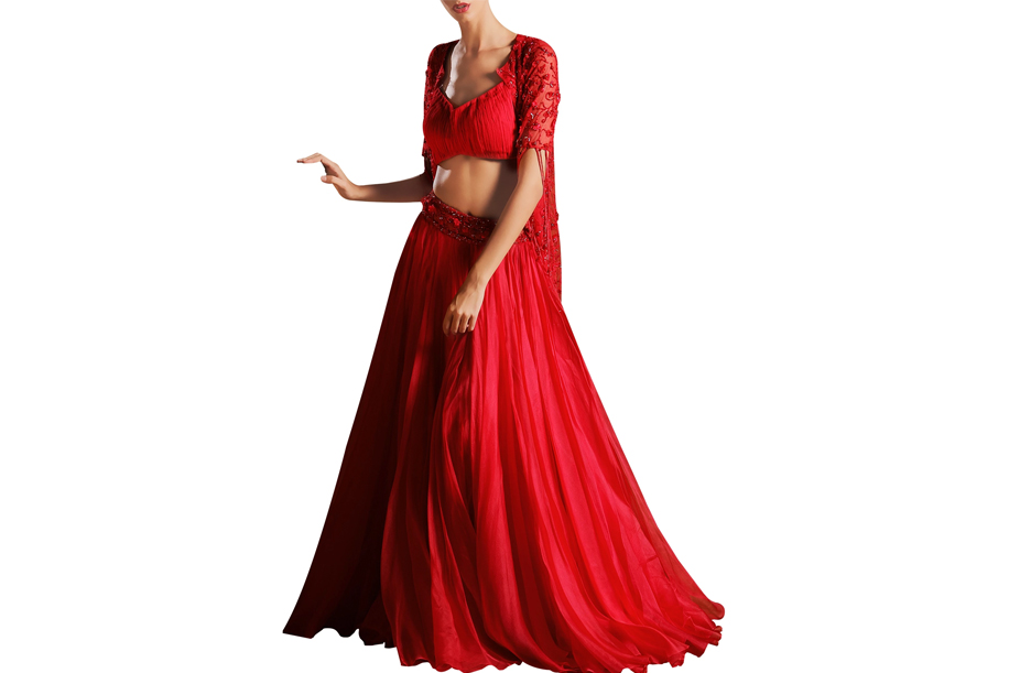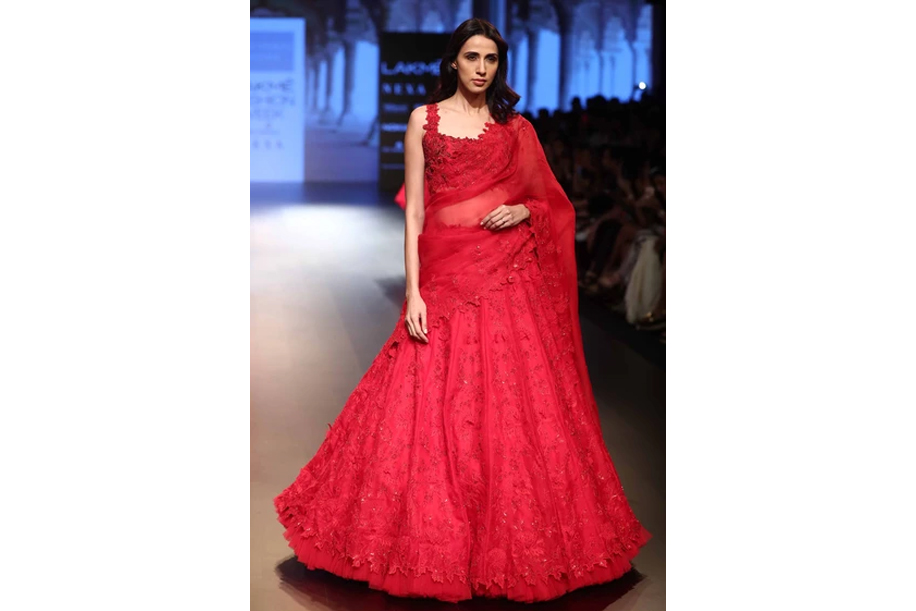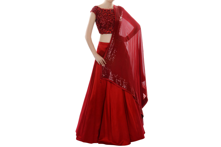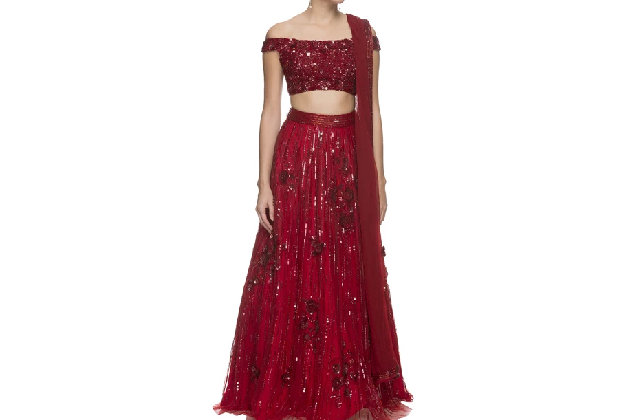 Known for her chic style, Priyanka Chopra stunned us with not one but two gorgeous wedding looks. She was a sight to behold in a crimson red embroidered Sabyasachi lehenga for her Indian wedding. While her sparkling customized lehenga, made of hand-cut organza flowers, French knots in silk floss, and Siam-red crystals cost a fortune, here are a few similar red lehengas that won’t.